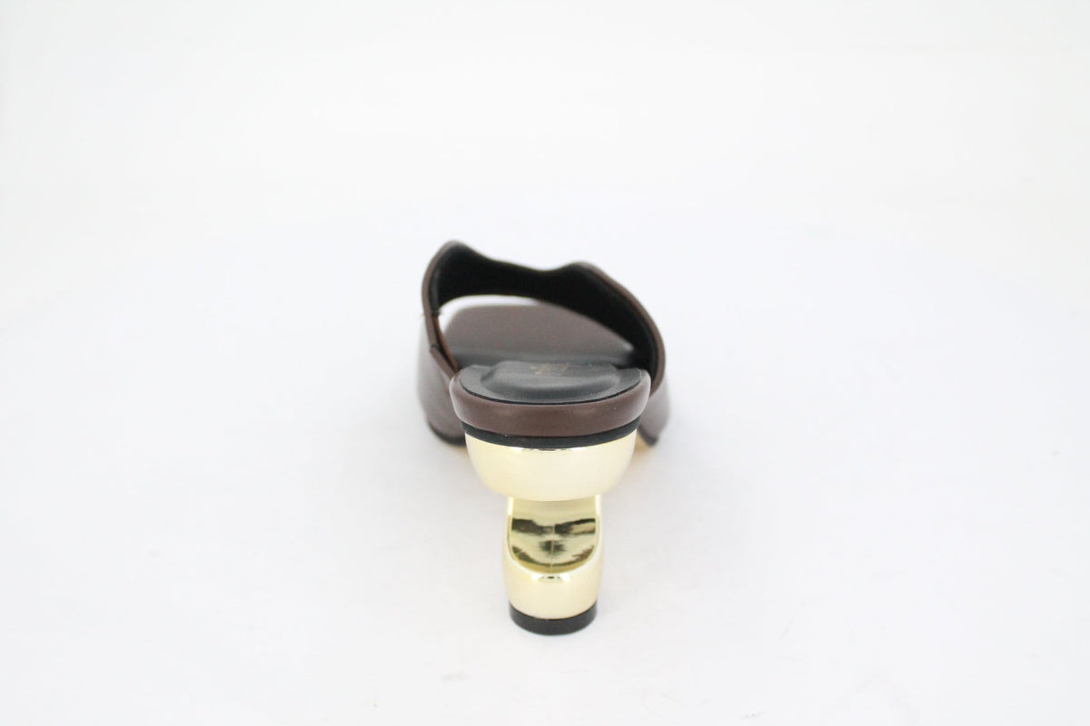 Step out in style with these Karmen Heel Mules. Crafted from smooth chocolate brown leather like finished, these mules feature a unique, sculptural gold-tone heel and sole that elevates any look. The open back and square toe add a modern touch, making them a statement piece for any fashion-forward wardrobe.