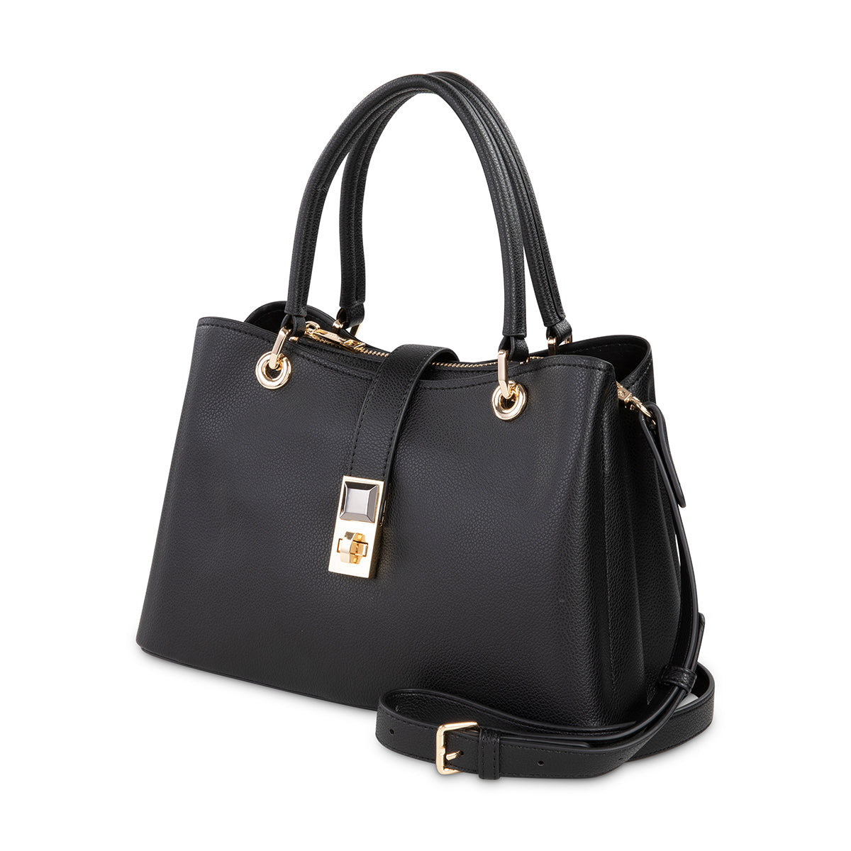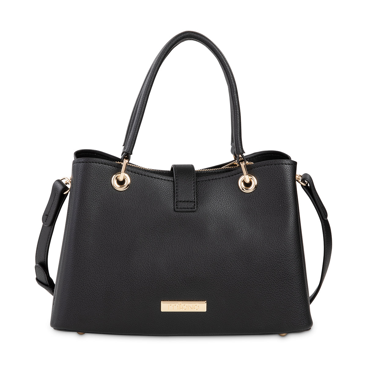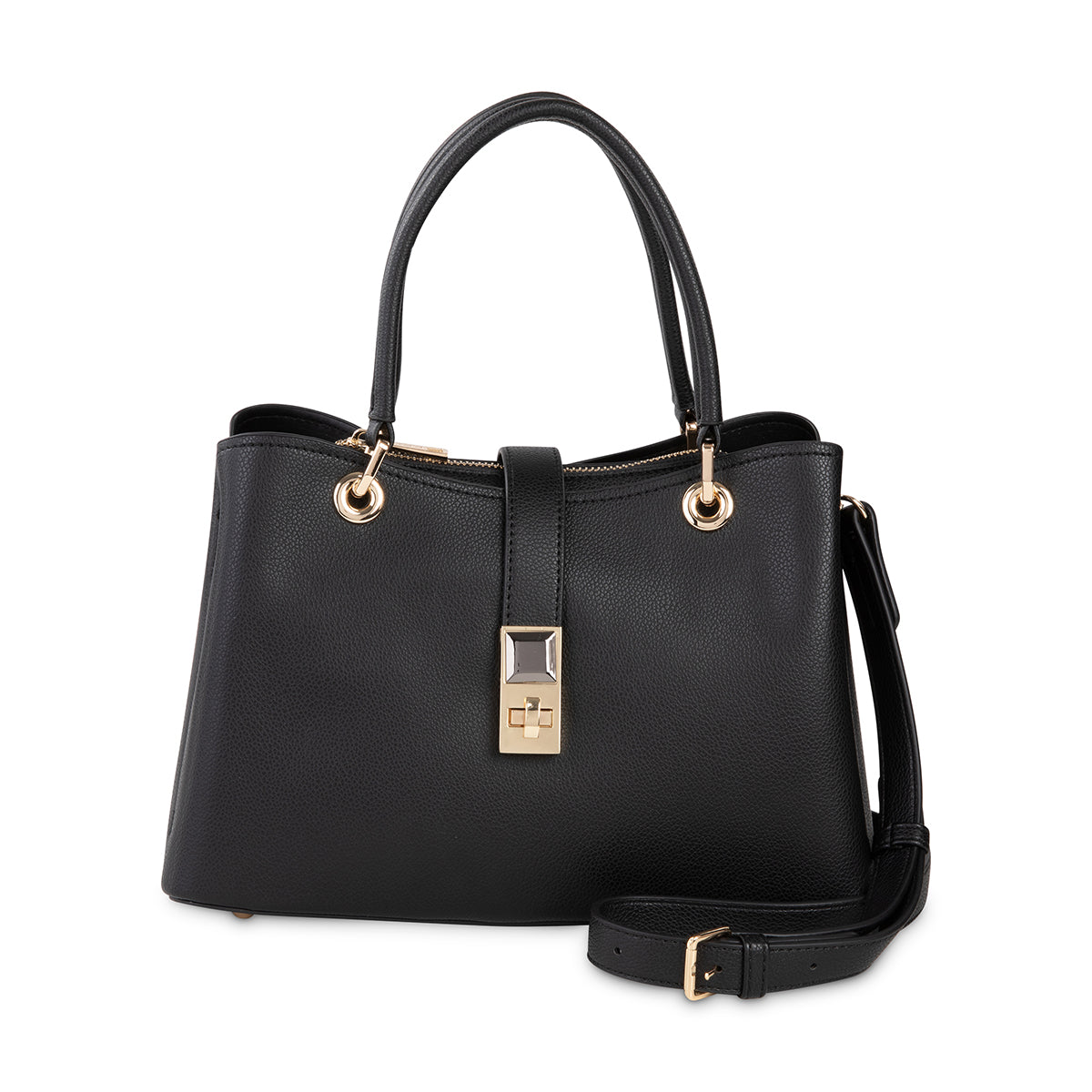 Add a touch of modern elegance to your look with this black Kathleen Shopper. Designed with a top handle for classic sophistication and a detachable long strap for crossbody versatility. The feature lock adds a stylish touch, while internal pockets keep your essentials organized.