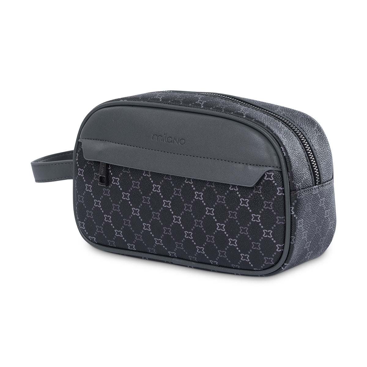 Black and grey toned monogram wash bag with embossed Milano plate, front zip pocket and grab handle