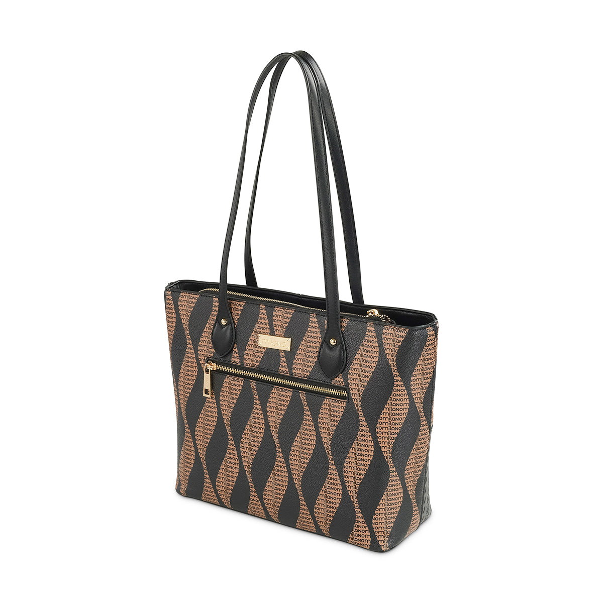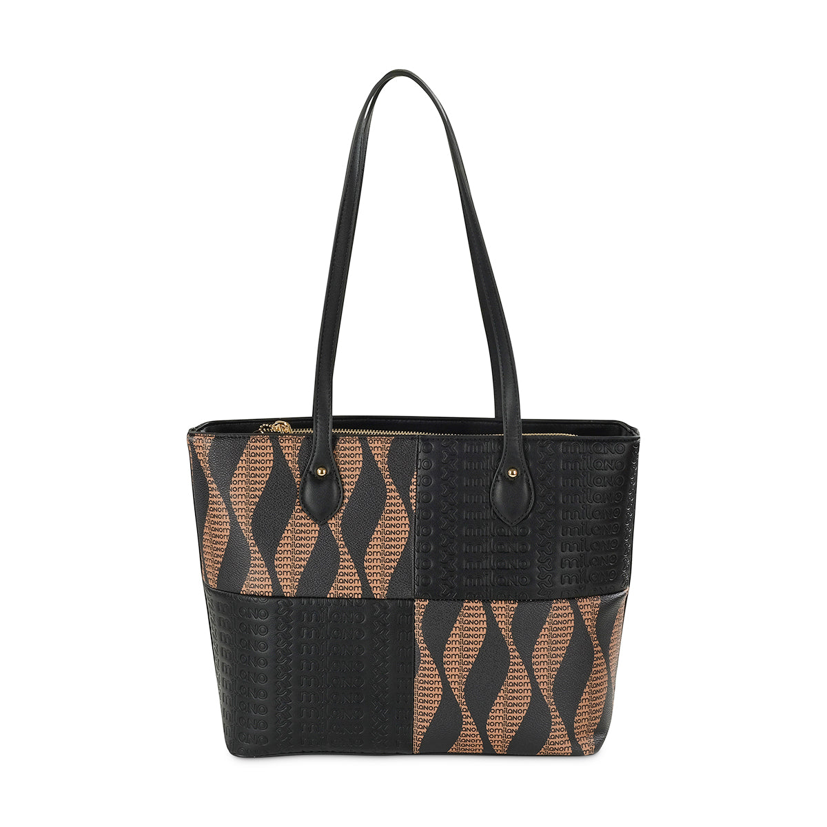 Make a sophisticated statement with our unique two-tone tote bag. This structured piece features an artistic patchwork design, blending sleek black and tan panels with captivating wavy patterns and subtle woven textures. Complete with comfortable top handles, it's a distinctive and spacious accessory for any discerning individual.