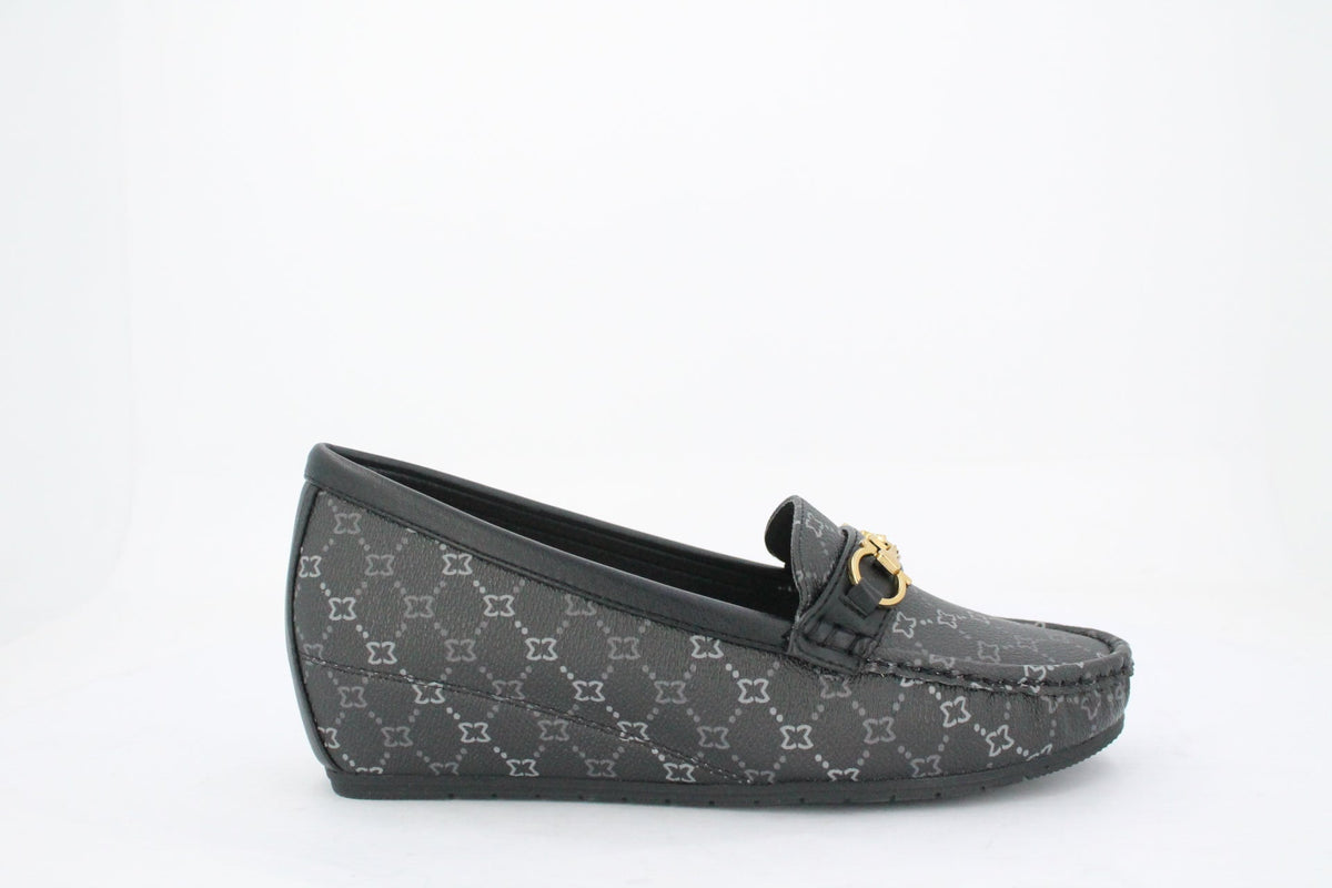 Step into sophisticated style with these ladies' slip-on moccasins. Featuring a new Milano monogram patterned upper in a dark gray hue. The low wedge heel ensures comfort, making them perfect for both casual and semi-formal occasions.