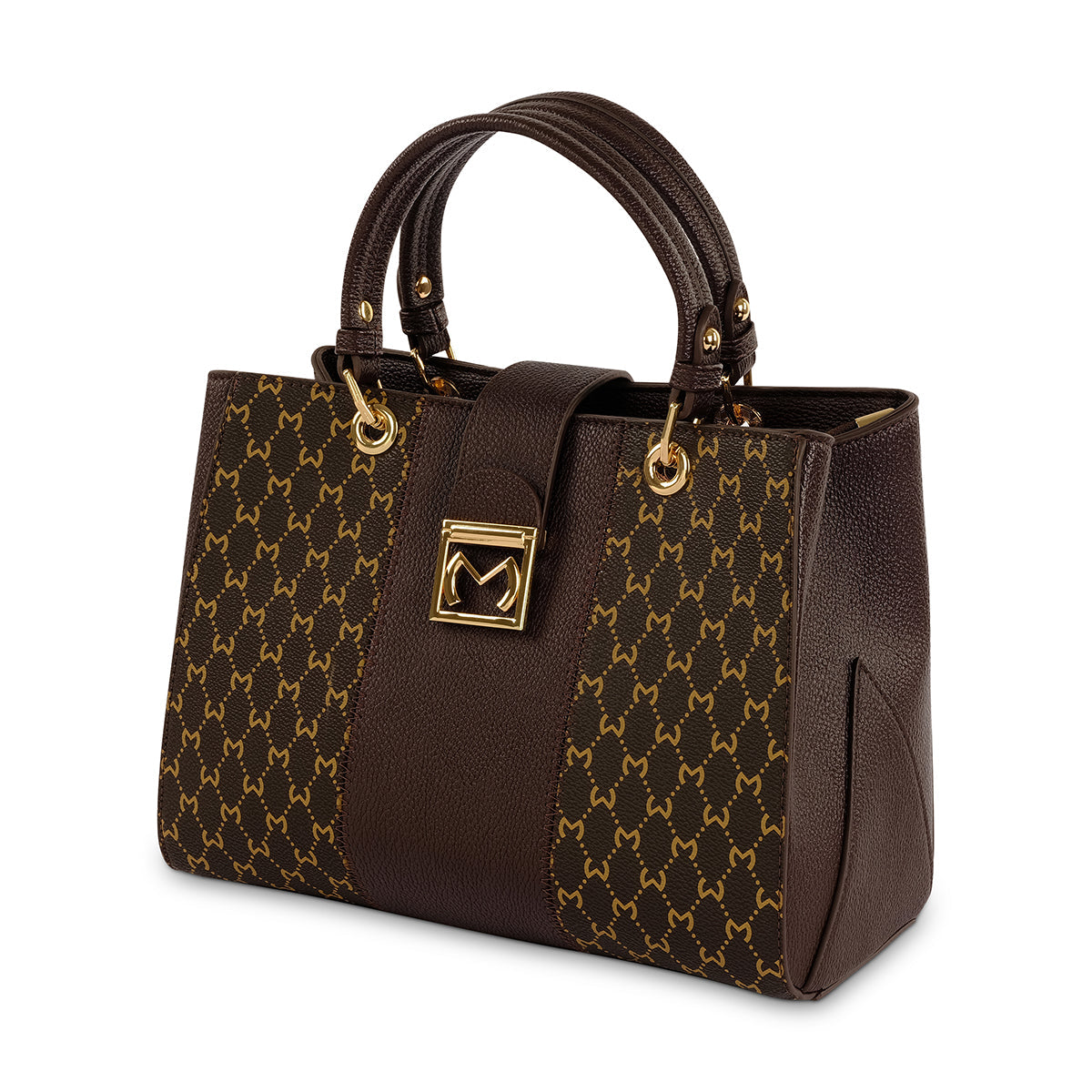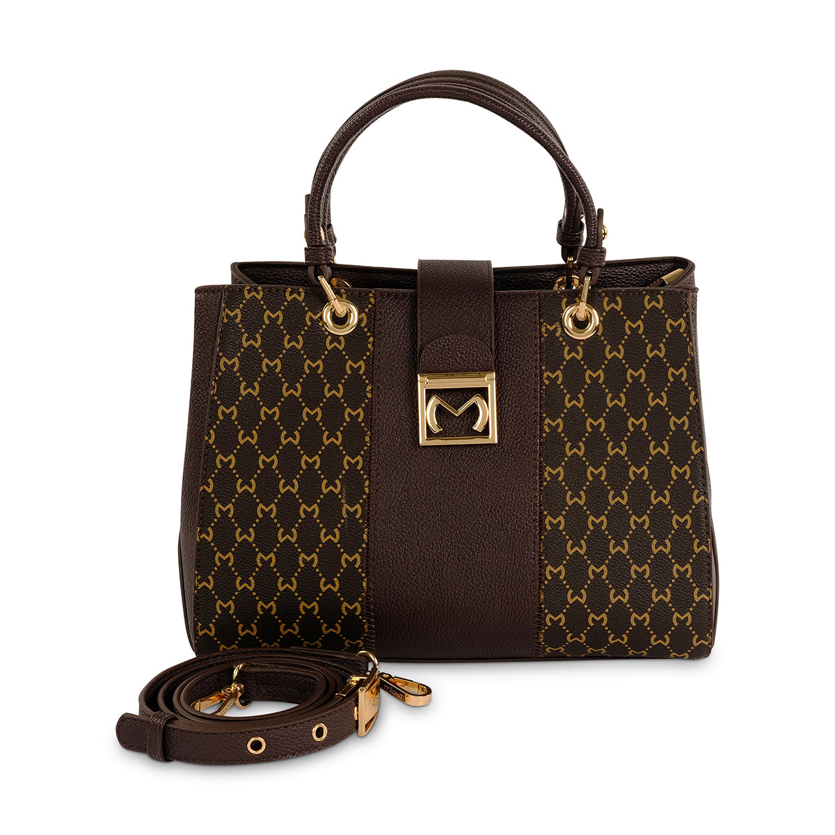 A classic brown monogram tote with branded hardware, multiple compartments for maximum storage and combination of hidden closures. Featuring twin handles and adjustable long strap.