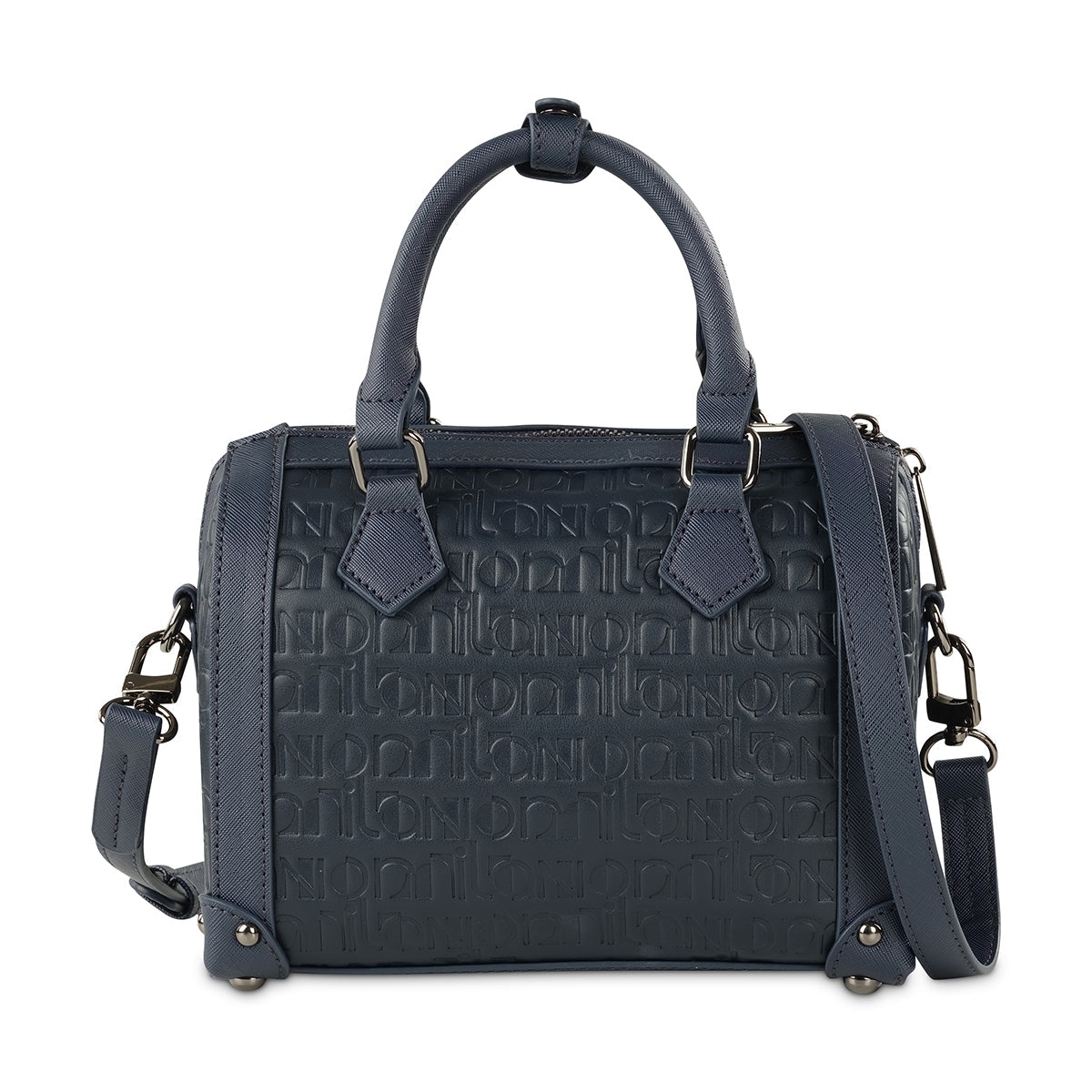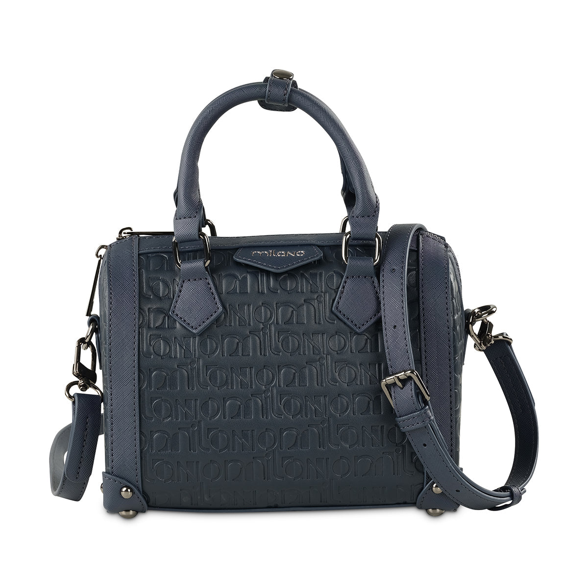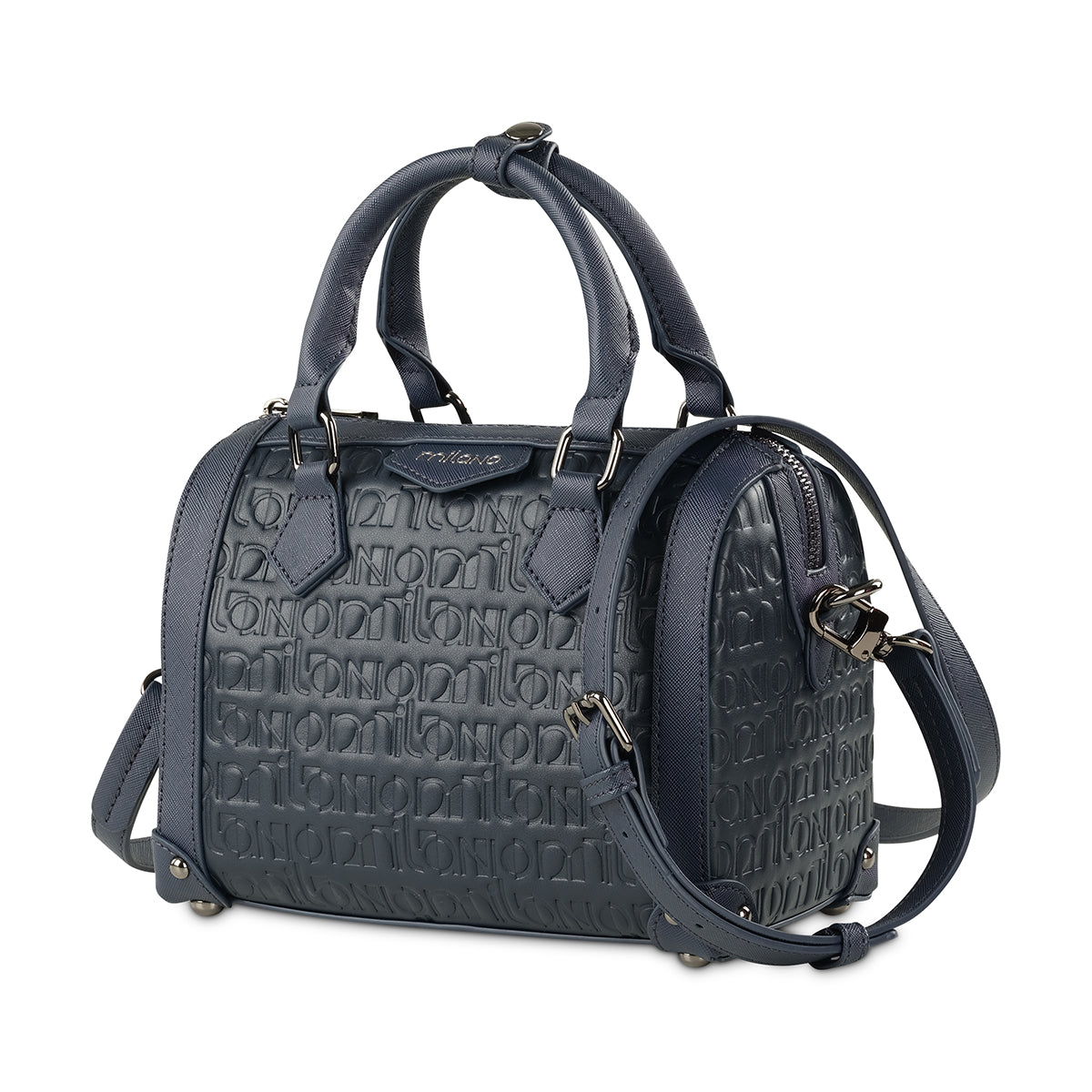 Discover unique style with our Malaika Barrel Bag in elegant navy blue. This distinctive duffle-shaped bag features an all-over monogram print, complemented by sleek top handles and robust metallic corner details. With its secure top zip closure and versatile detachable strap, it's a chic and practical companion for travel or everyday adventures.