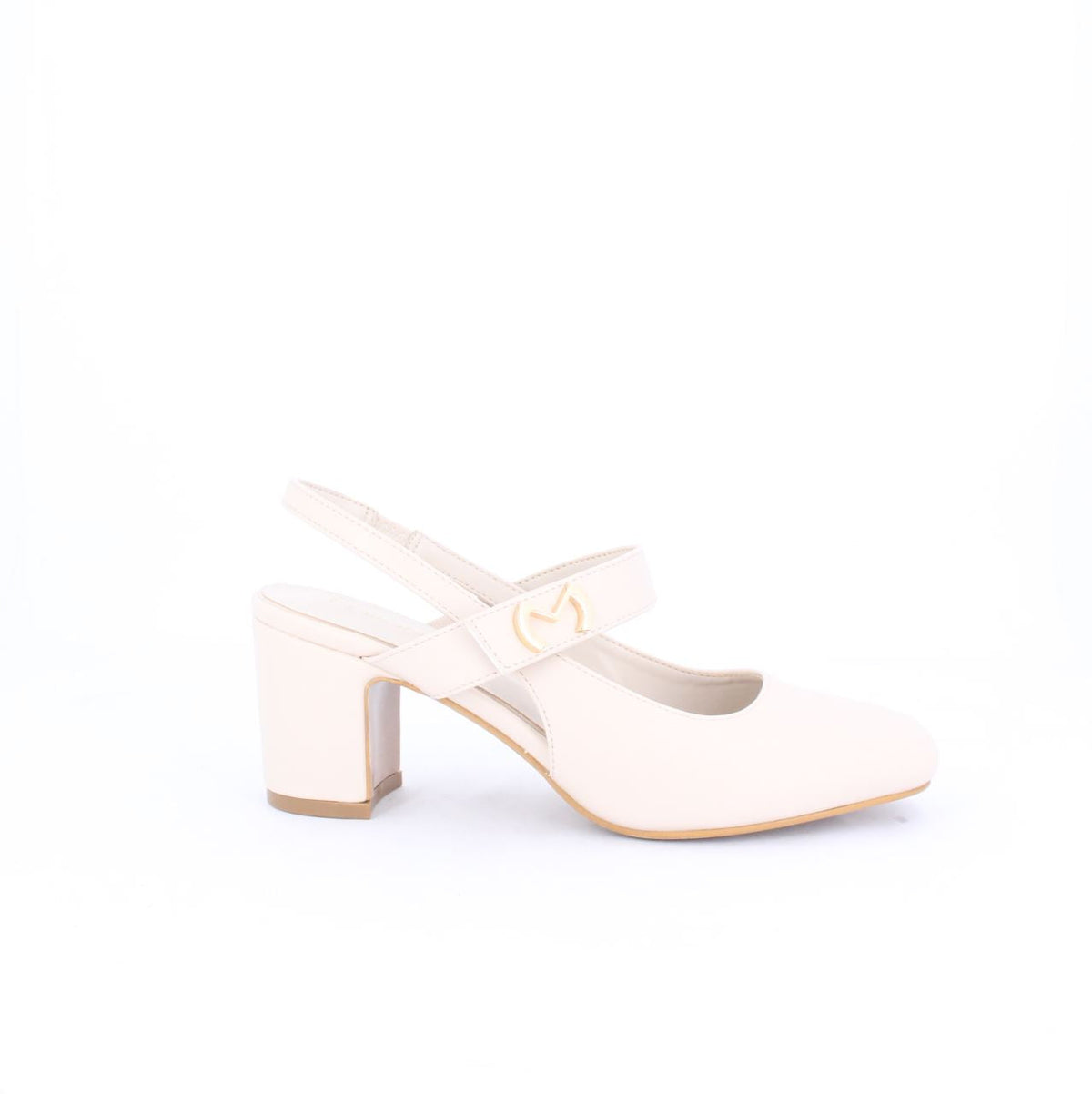 Marcedita slingback block-heeled shoe with a square toe. It has a wide strap across the top, adorned with a gold-tone "M" metal trim logo, adding a touch of elegance. The heel is chunky and of moderate height, providing both style and comfort.