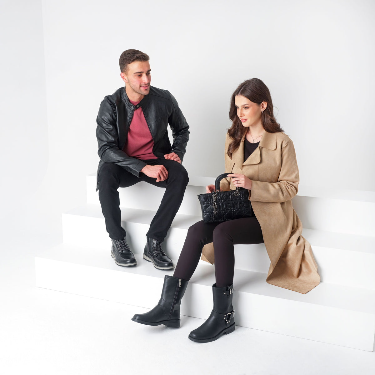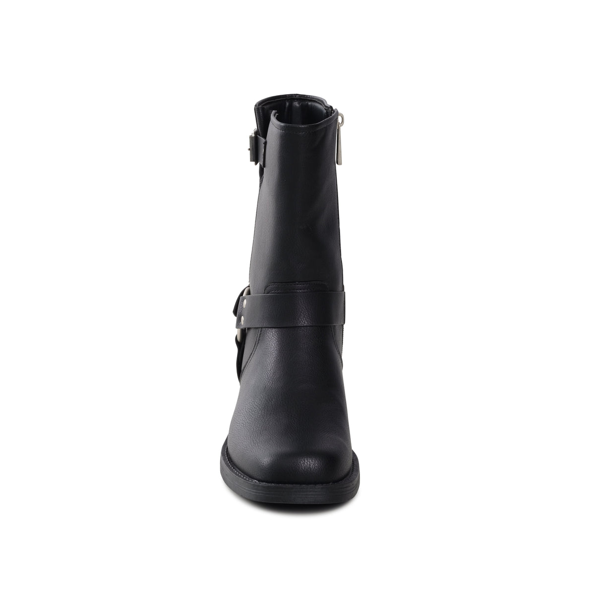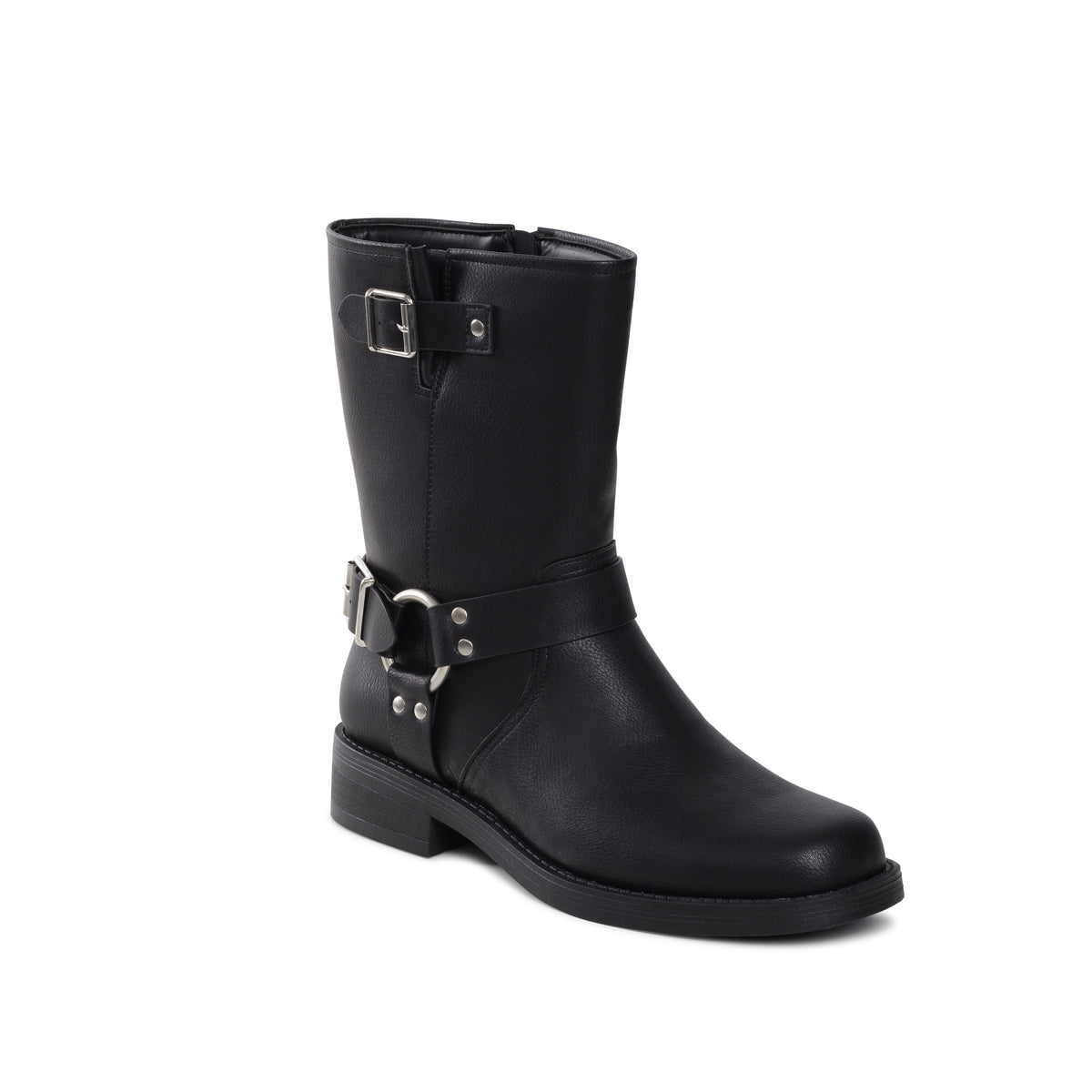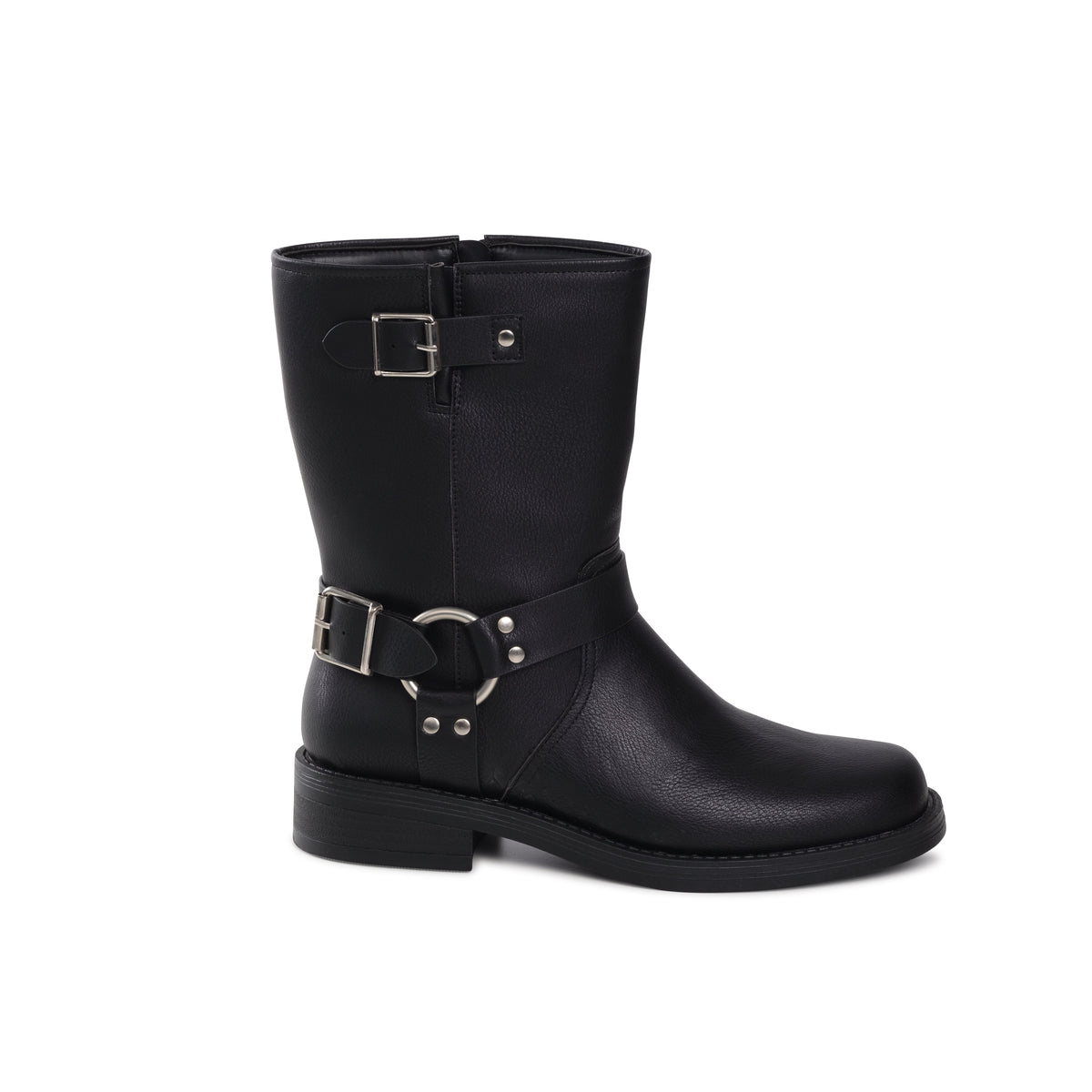 Martinna is a mid-calf boot with a rugged, biker-inspired design. It has a slightly rounded toe and a low heel, giving it a sturdy casual look, two prominent silver-tone buckles adding to the tough, utilitarian aesthetic. Perfect for casual or edgy outfits.