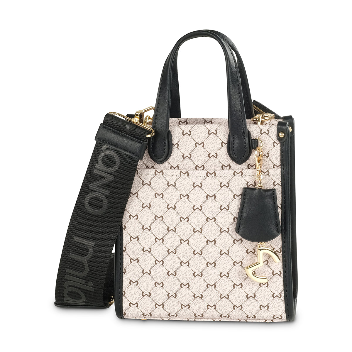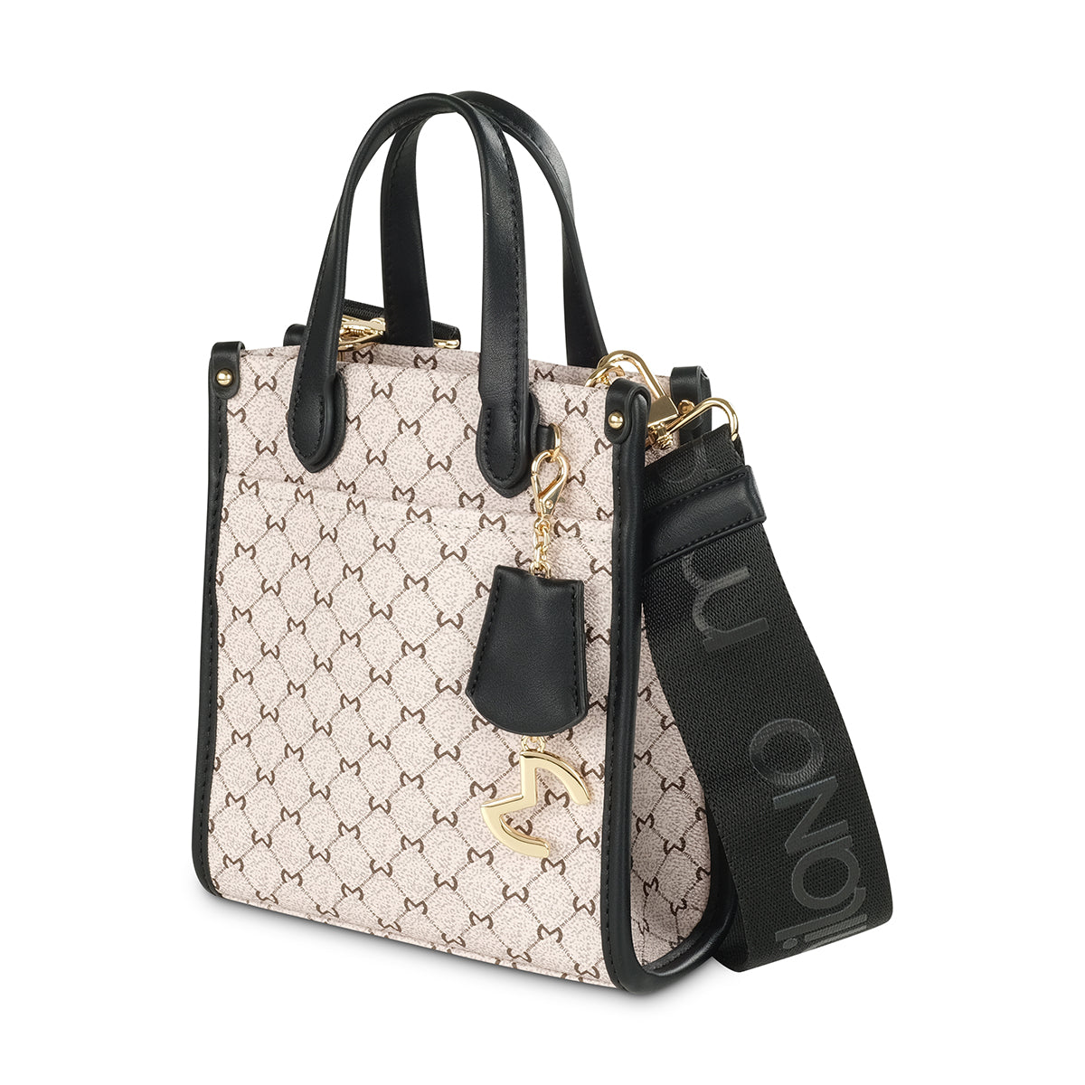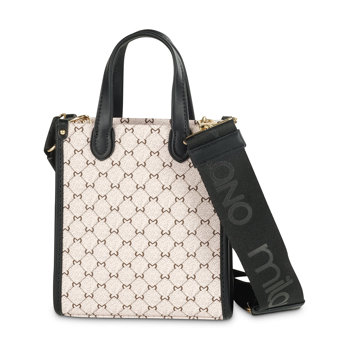 Discover striking elegance with our mini tote bag, featuring a sophisticated light beige monogram print body beautifully framed by sleek black trim and handles. Adorned with a central gold-tone emblem and protective hardware, this structured bag is a timeless accessory perfect for carrying your essentials with refined style.