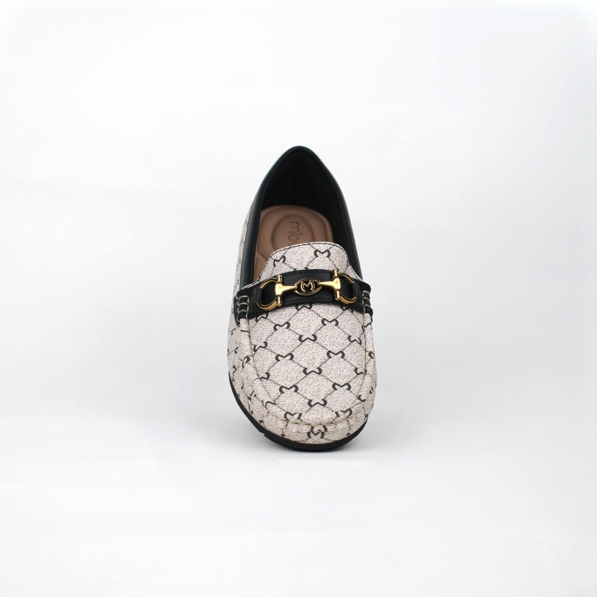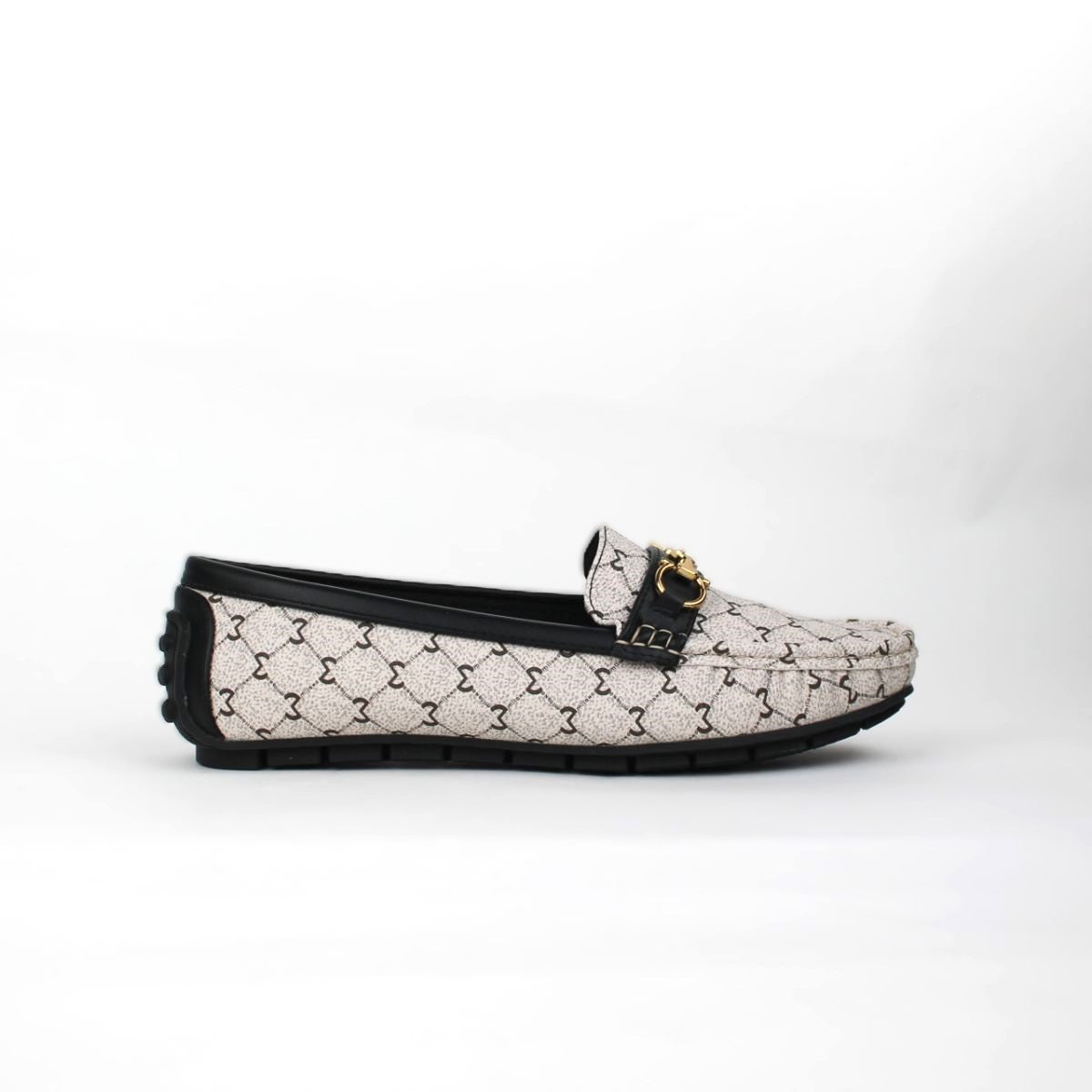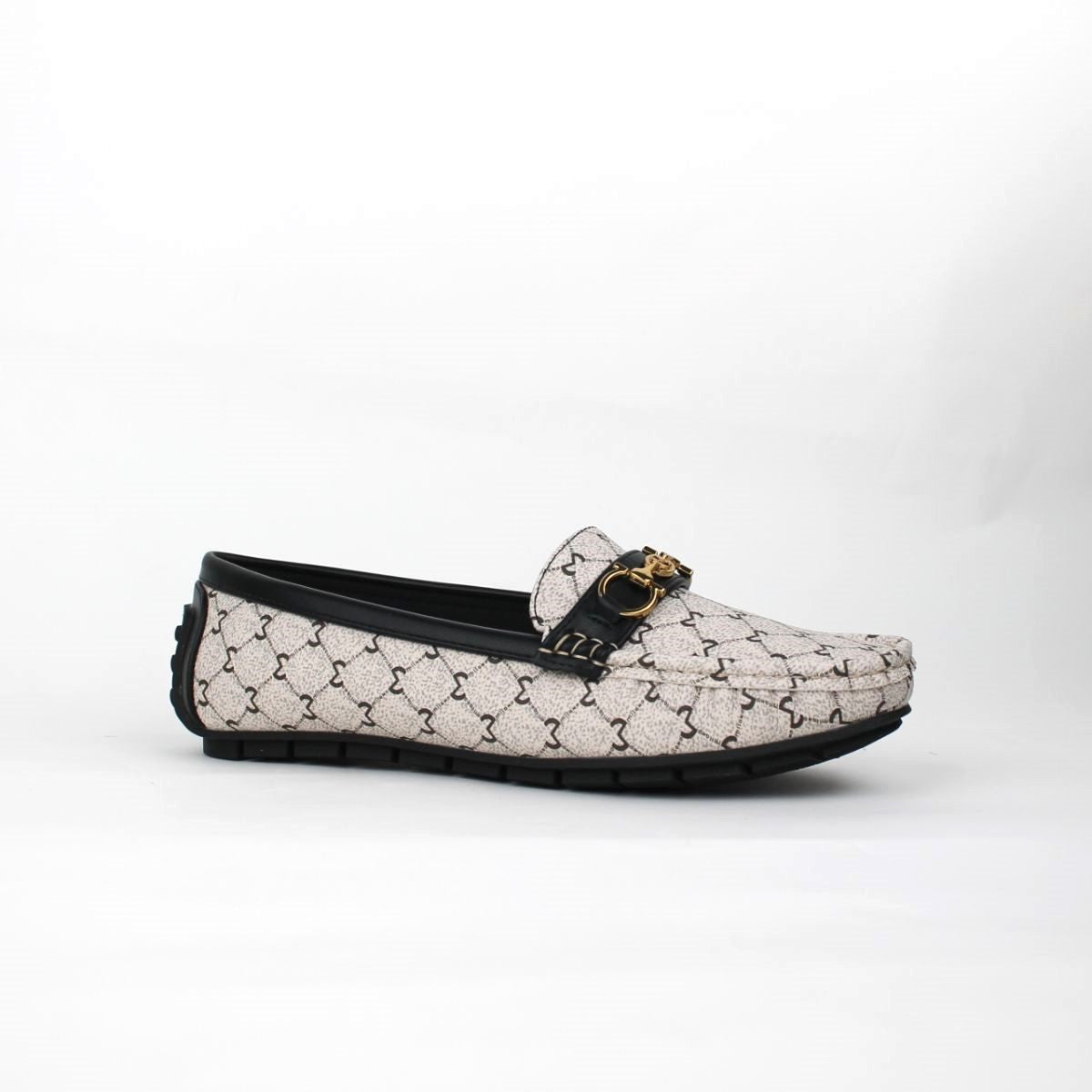 Slip your foot into comfort and style with this classic moccasin which showcases a new monogram print on the upper, has a metal trim which makes the whole shoe elegant and a comfort footbed that will keep your feet relaxed all through the day.