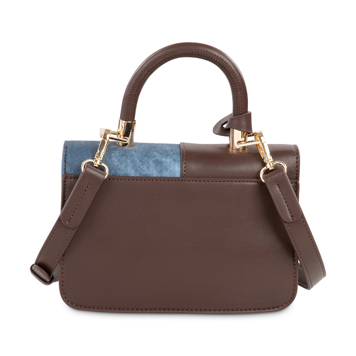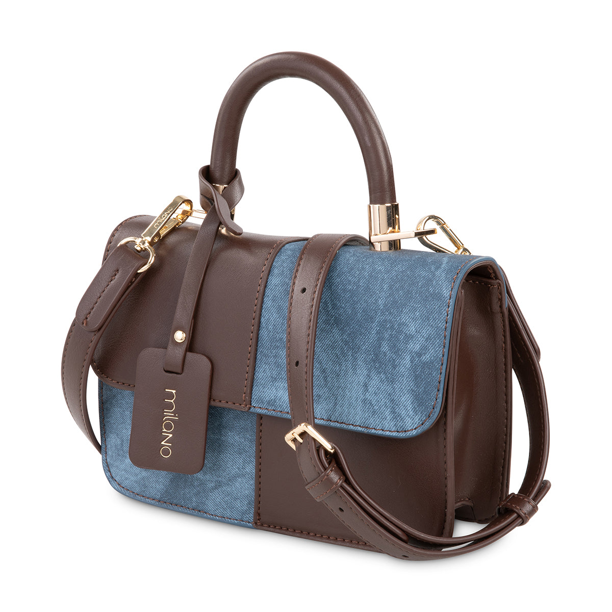 Make a statement with this color block satchel. The navy and rich chocolate brown combination offers a sophisticated yet contemporary look. Detachable strap, top handle, Milano plate, and interior pockets.