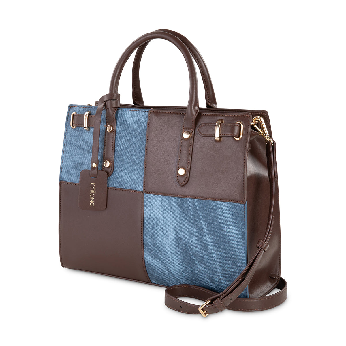 Make a statement with this color block tote. The navy and rich chocolate brown combination offers a sophisticated yet contemporary look. Detachable strap, top handle, Milano plate, and interior pockets.