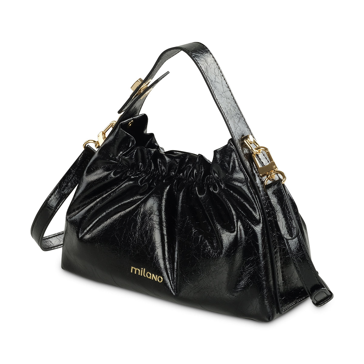 Elevate your style with our chic black patent gathered bag. Its high-shine finish and unique cinched top create a modern, luxurious look, complemented by a subtle metallic "Milano" logo. Featuring a comfortable top handle and a structured base, this bag is a stylish statement piece for any occasion.