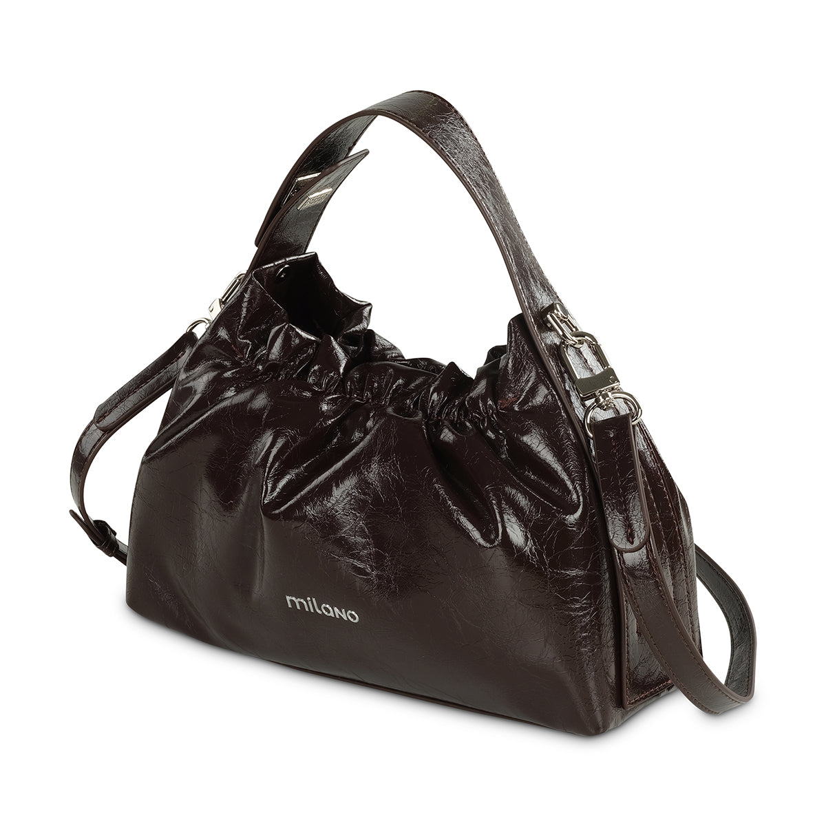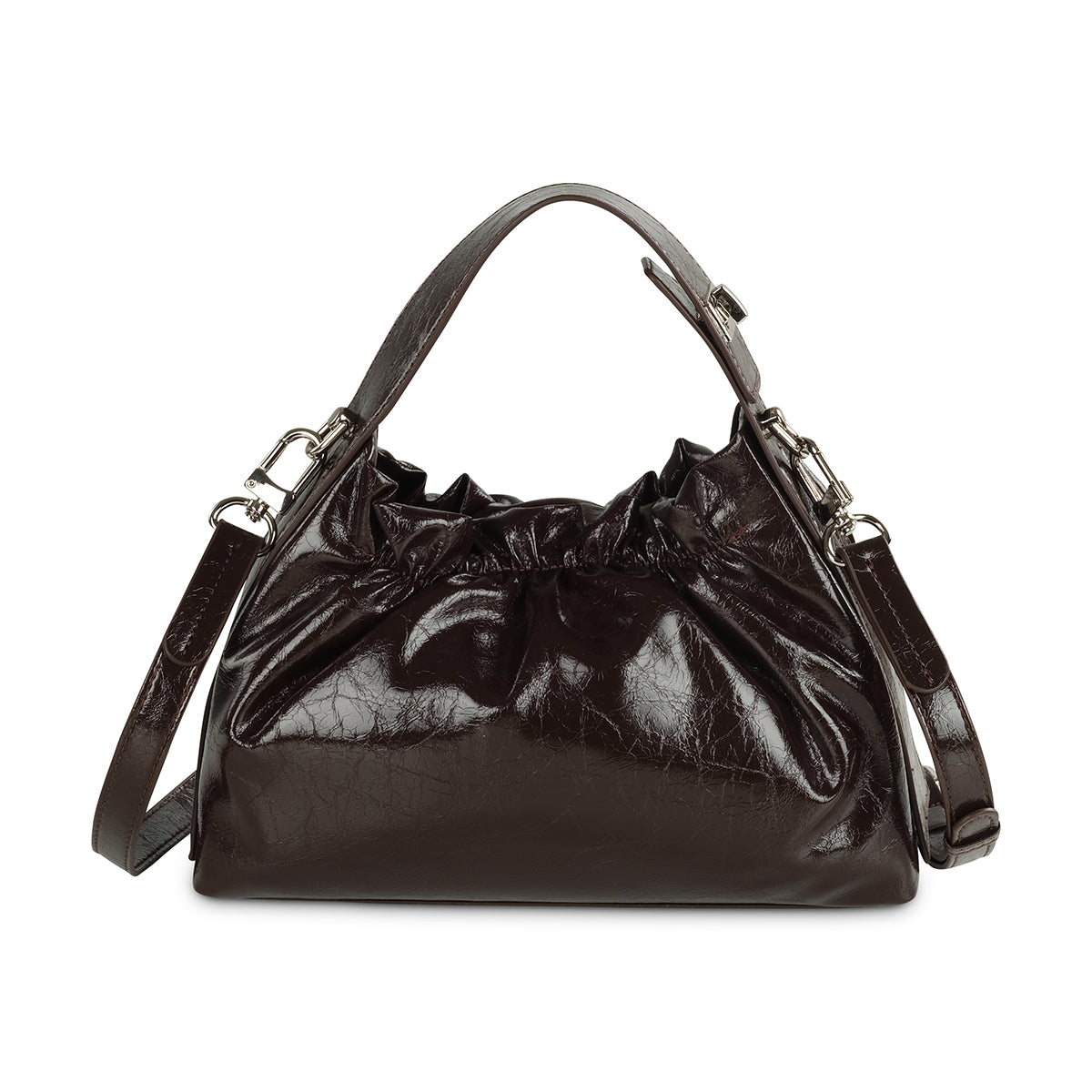 Dark Brown Patent Gathered Top Handle Bag. A captivating accessory that blends unique textures with a contemporary design for standout style.