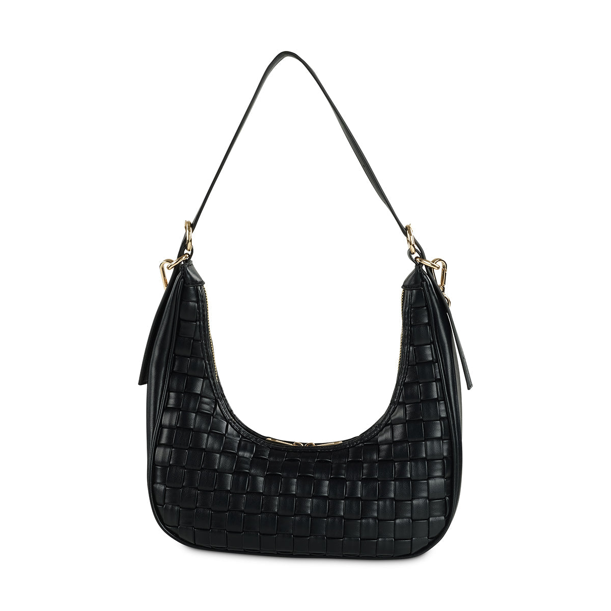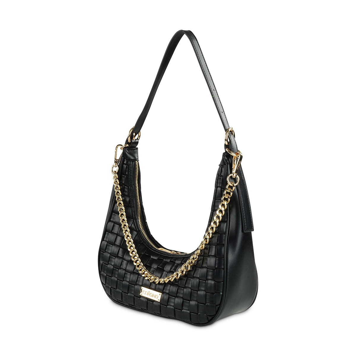 Embrace relaxed elegance with our chic black hobo bag. Its unique woven texture and soft, curved silhouette are beautifully accented by a bold gold-tone chain detail and a subtle metallic logo. With a comfortable shoulder strap and secure zip closure, this bag is a chic everyday statement.