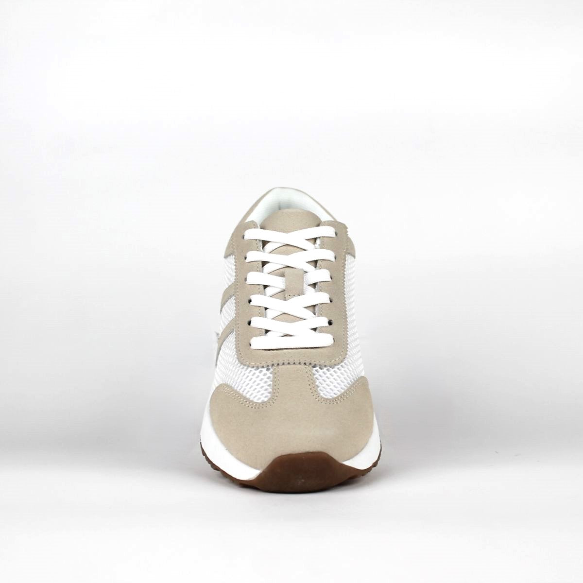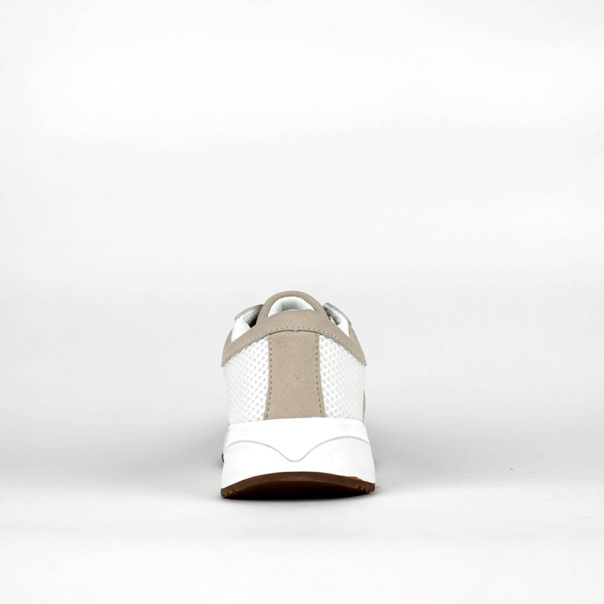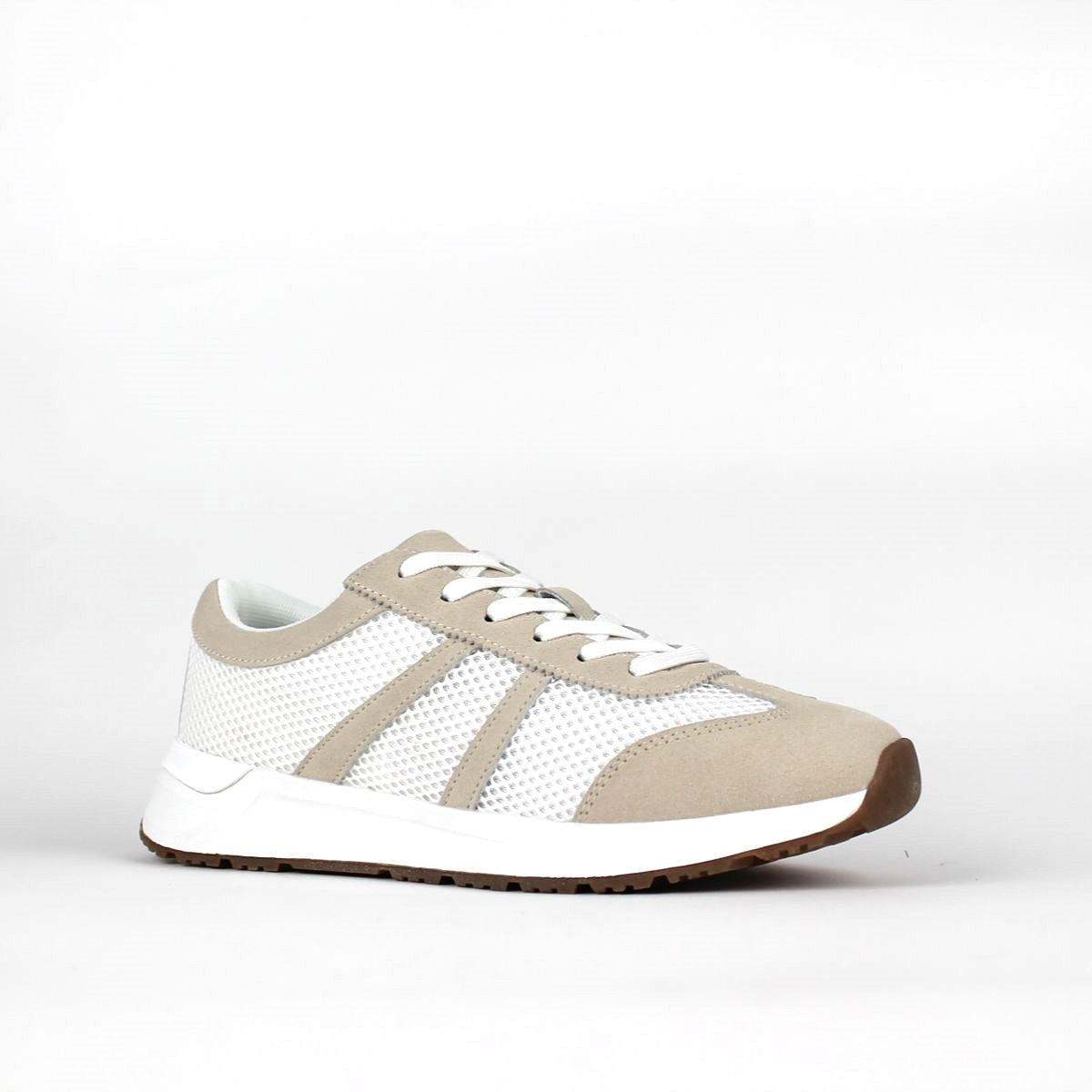 Stay effortlessly stylish in these RORI sneakers, perfect for everyday casual wear. The design features a breathable mesh upper accented with subtle blue panels and a classic white lace-up closure. A sleek metallic detail on the heel adds a modern touch. The durable sole combines a cushioned white midsole with a textured brown outsole for comfort and traction.