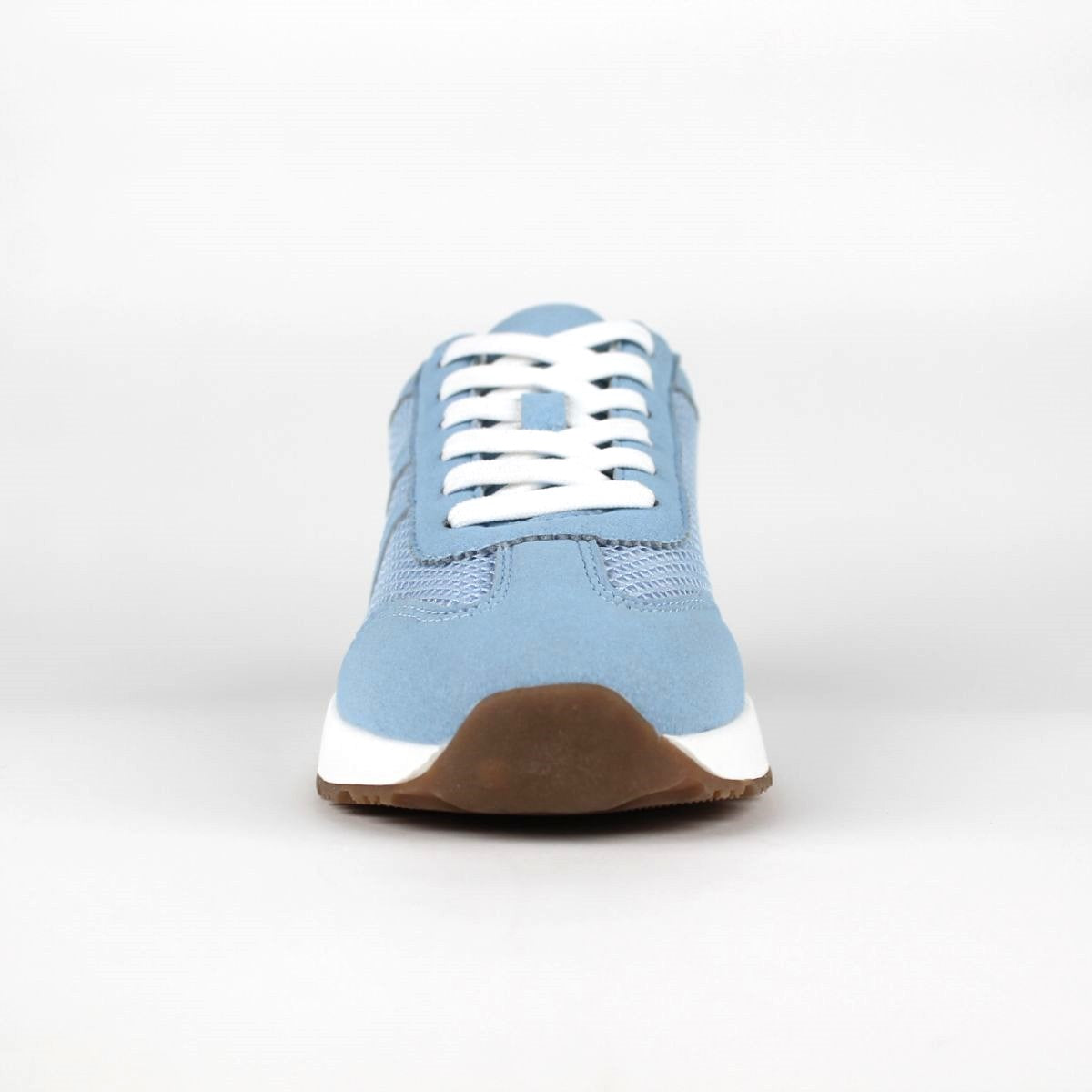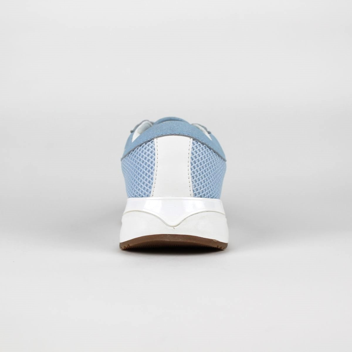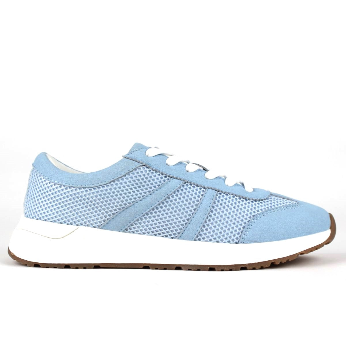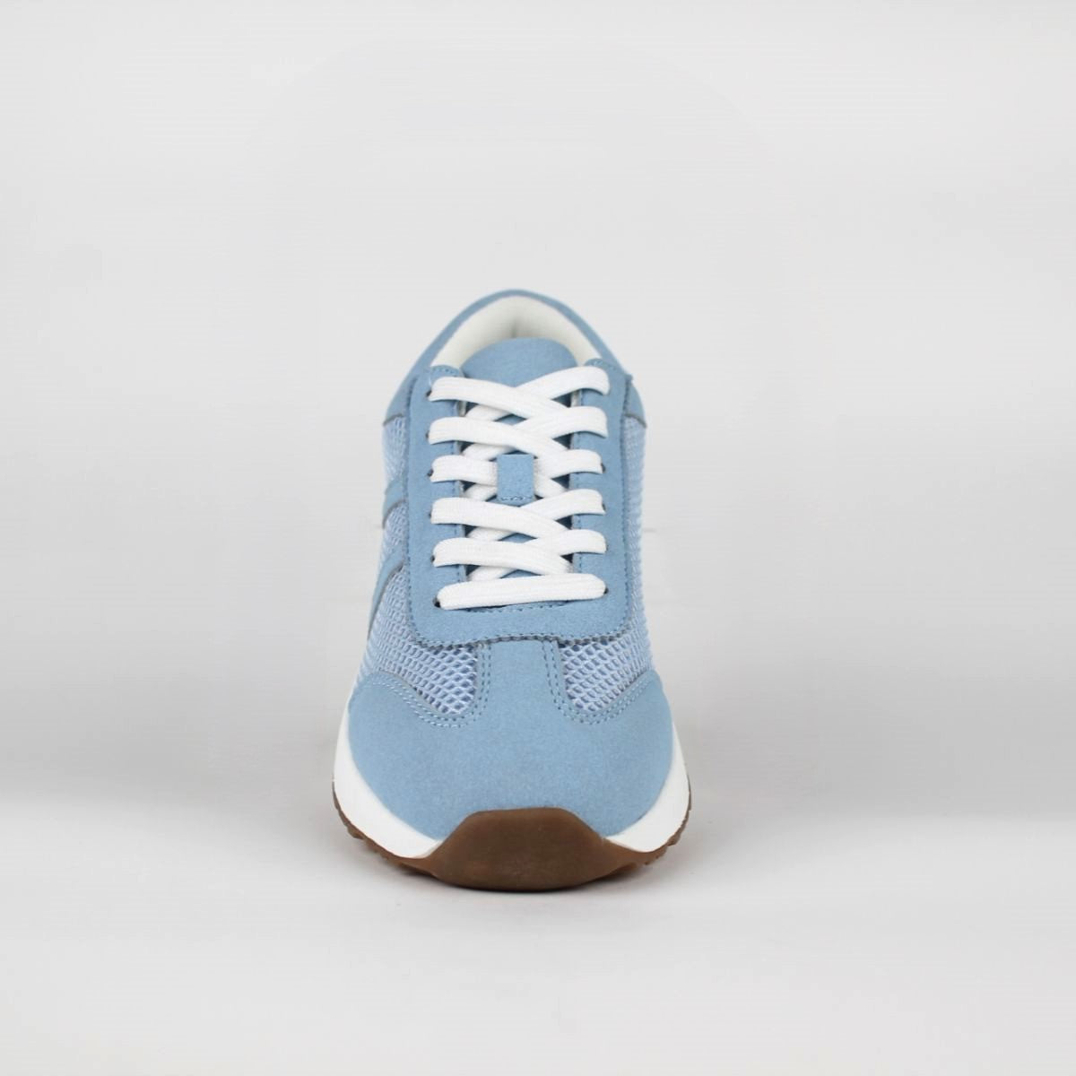 Stay effortlessly stylish in these RORI sneakers, perfect for everyday casual wear. The design features a breathable mesh upper accented with subtle blue panels and a classic white lace-up closure. A sleek metallic detail on the heel adds a modern touch. The durable sole combines a cushioned white midsole with a textured brown outsole for comfort and traction.