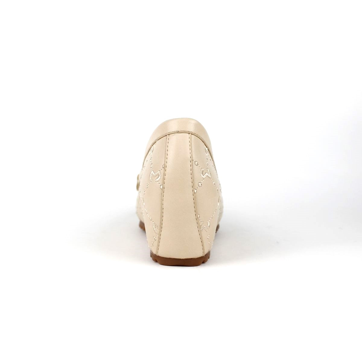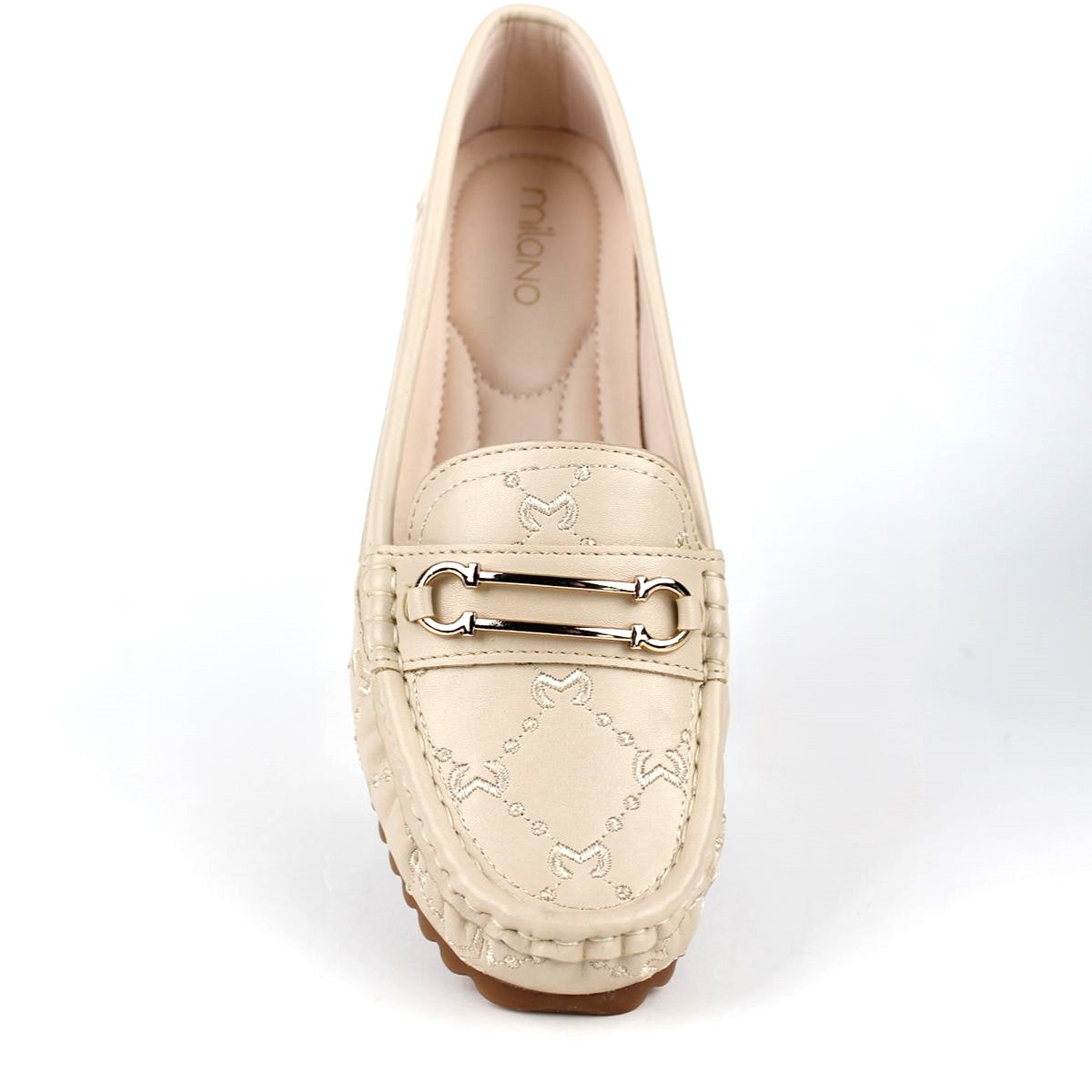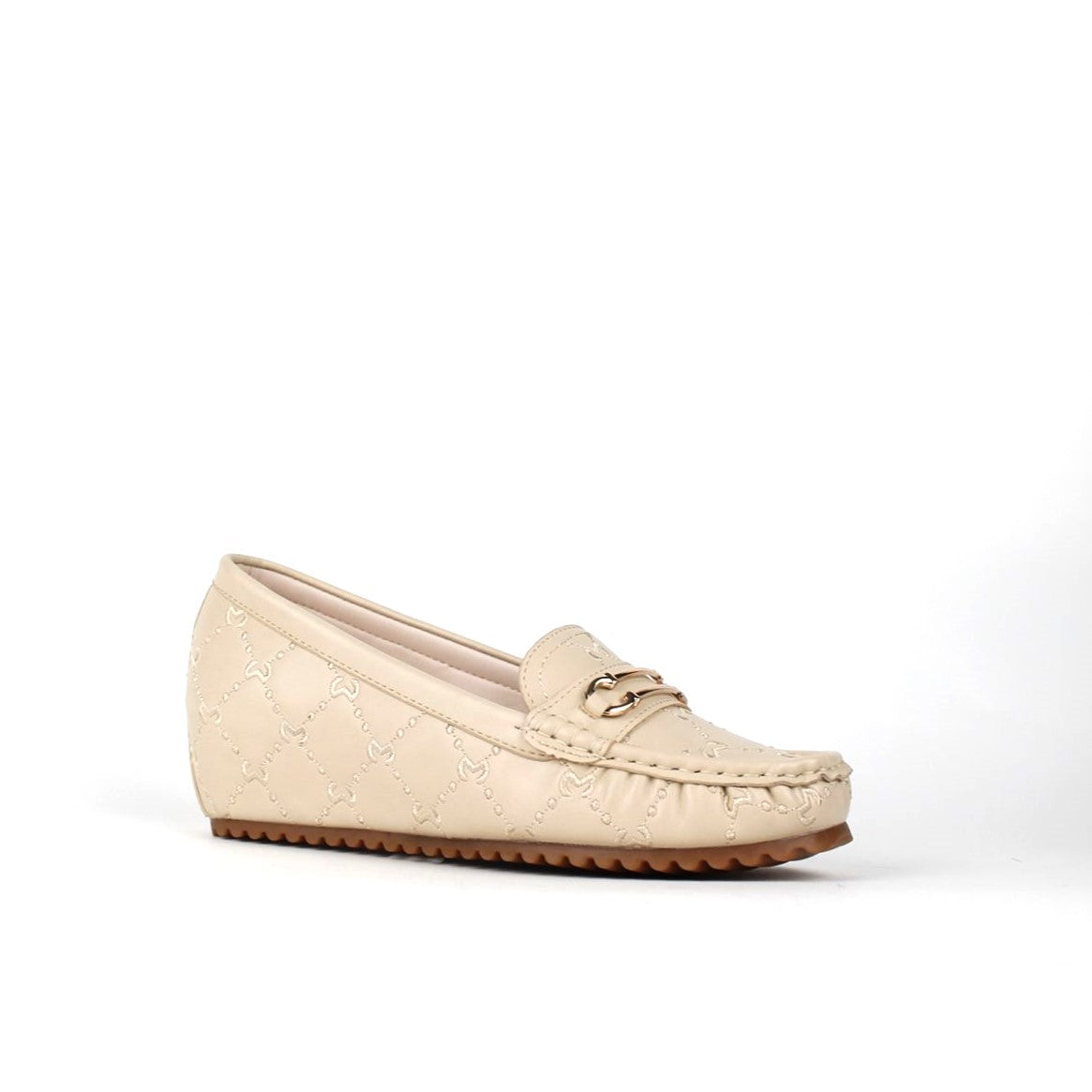 Stylish and comfortable wedge moccasins are elevated by an embroidered 'M' detail on the upper, giving them a sophisticated look. A decorative gold-toned buckle on the vamp adds a touch of elegance, while the hidden wedge heel provides a comfortable lift, making them ideal for all-day wear.