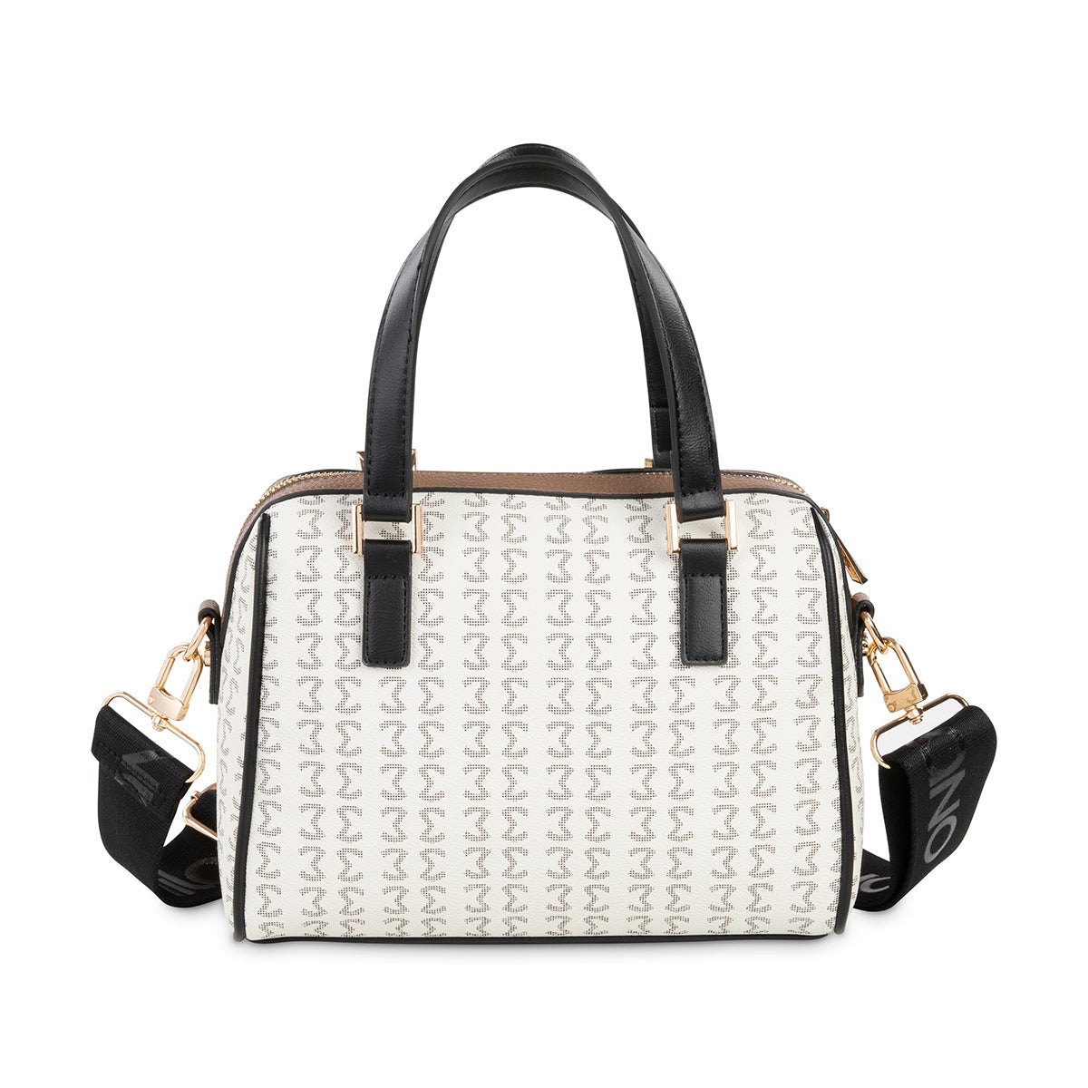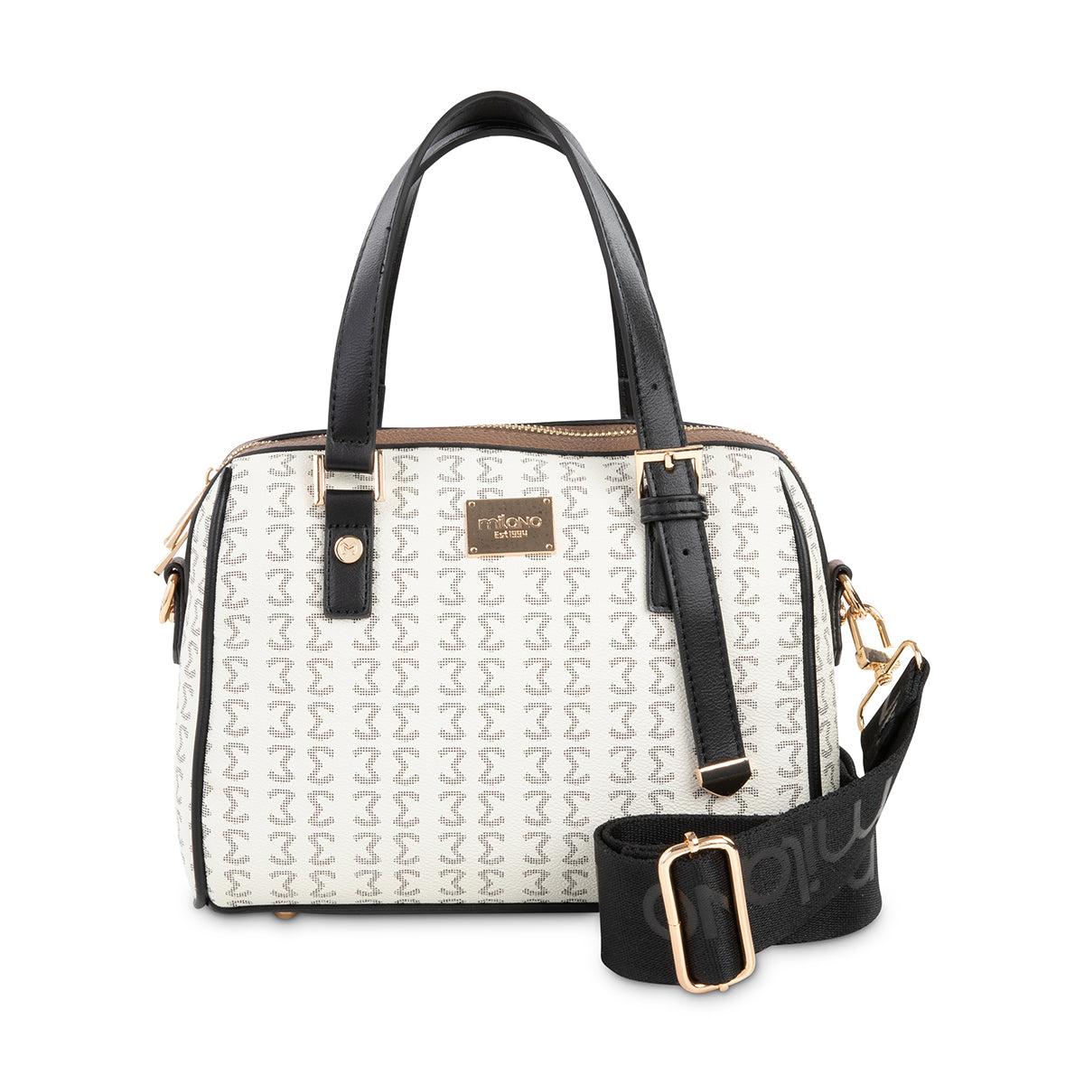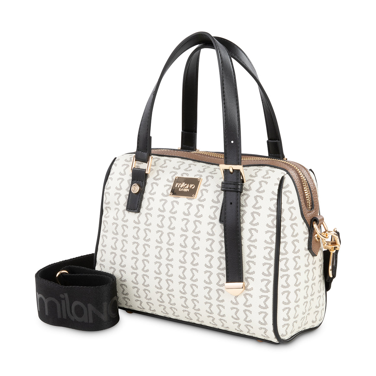 Milano monogram barrel bag, with contrasted colour blocked tan and black trim, striking asymmetrical handle, Milano metal branded plate, long detachable strap for muti purpose use and internal pockets