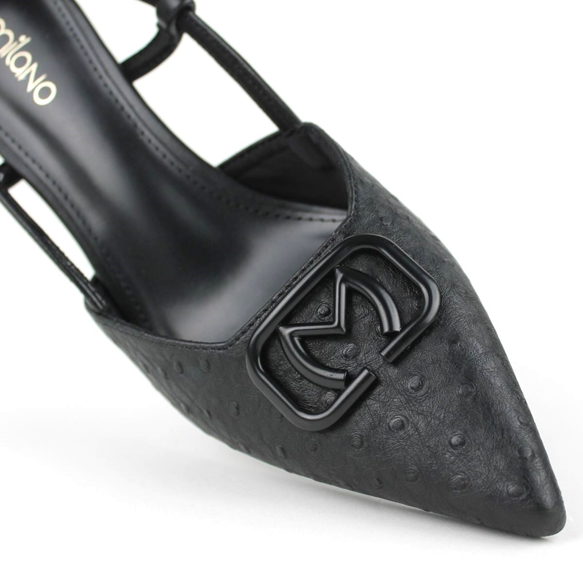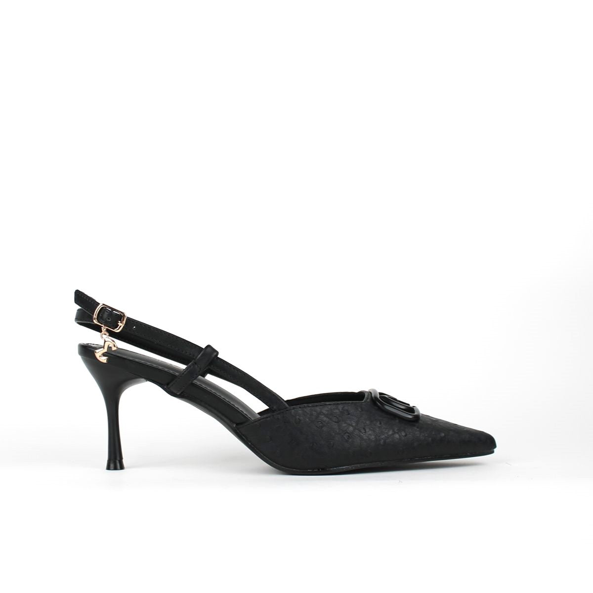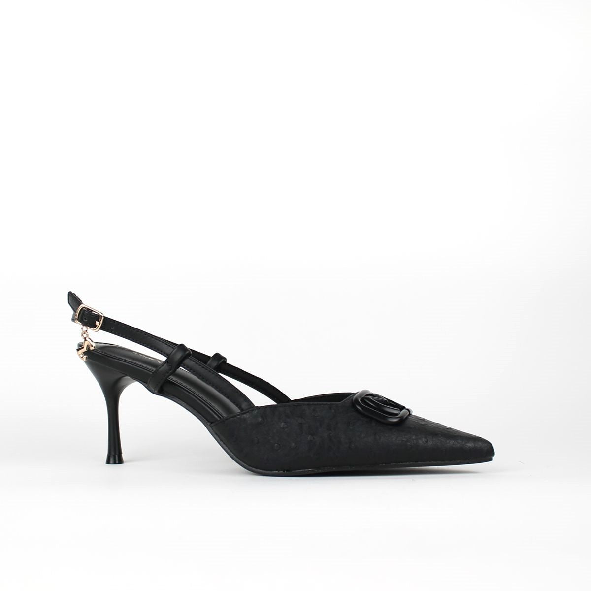 These sophisticated slingback pumps, crafted in an ostrich-textured finish, are a versatile addition to any wardrobe. Featuring a sharp pointed toe and a sleek stiletto heel, they exude elegance making them perfect for both professional and evening occasions.