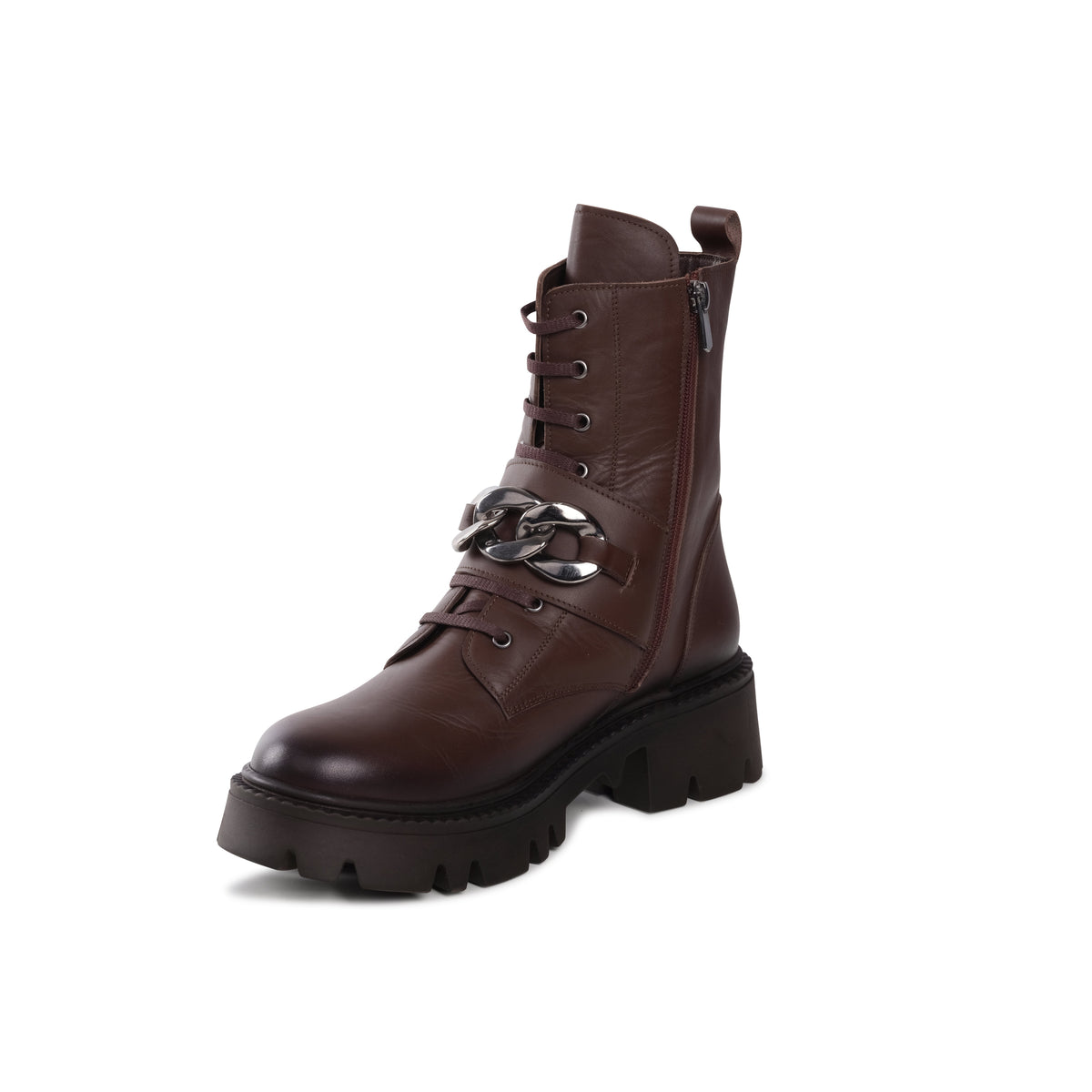 Yazi combat-style boot with a rugged and utilitarian aesthetic. The boot features lace-up details with metal eyelets for a secure fit and additional decorative elements, such as a buckle strap and a metallic ring across the midfoot, giving it a bold and edgy look. The leather material gives the boot a polished yet tough appearance, perfect for casual and street-style outfits.
