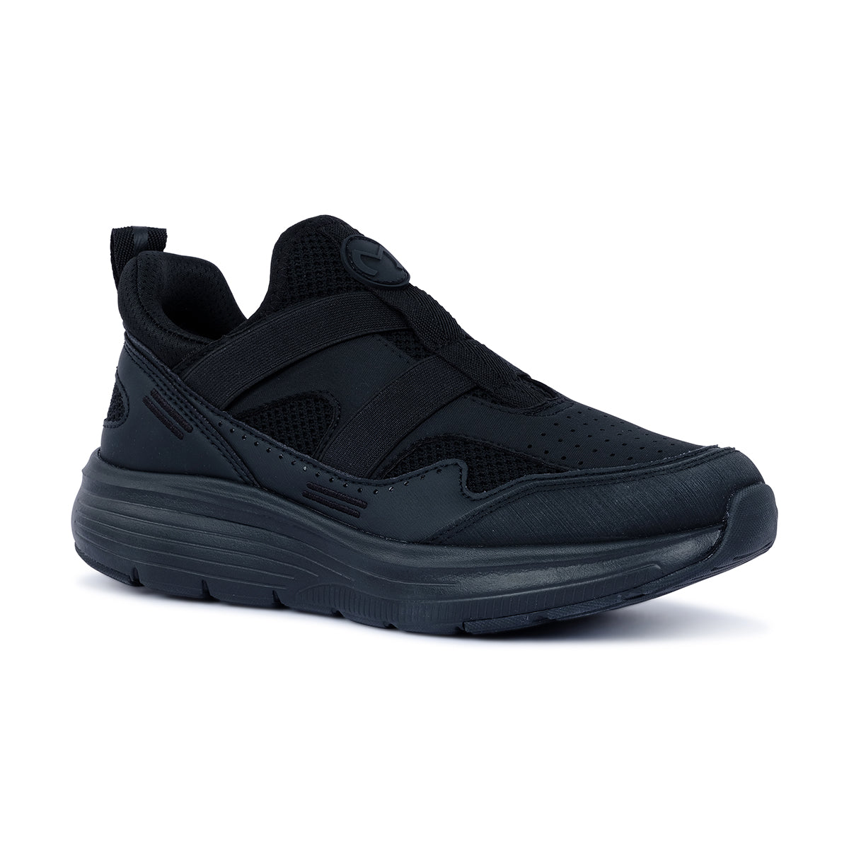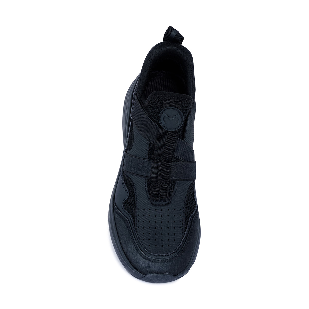 Sporty black slip-on sneaker with breathable mesh panels and wide elastic straps for a secure fit. Set on a chunky cushioned sole with gum detailing for modern comfort and style.