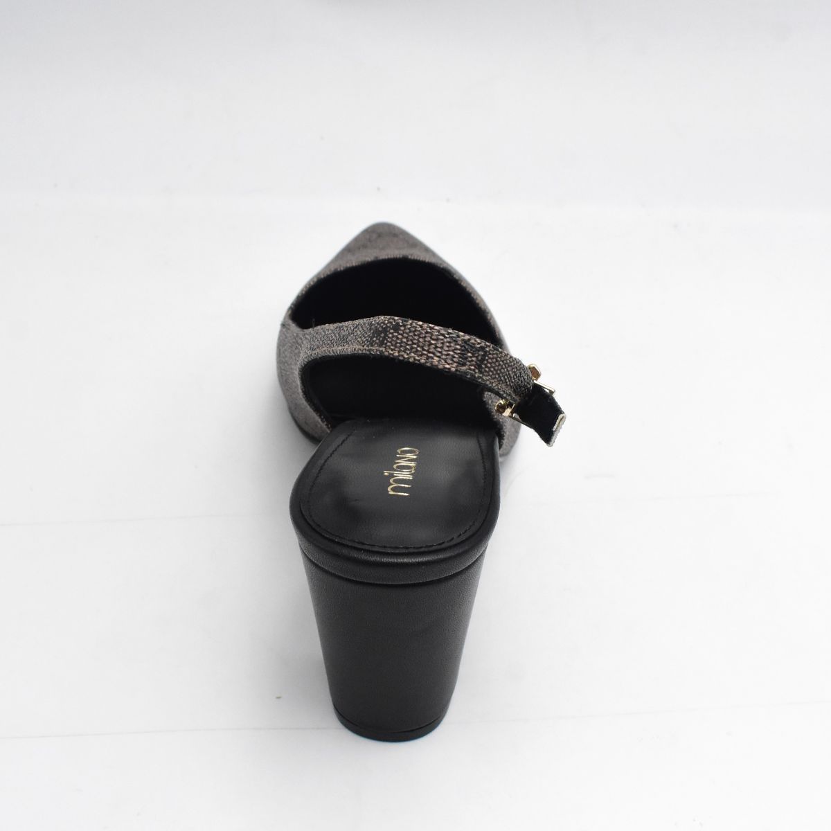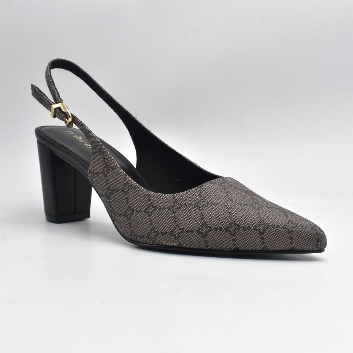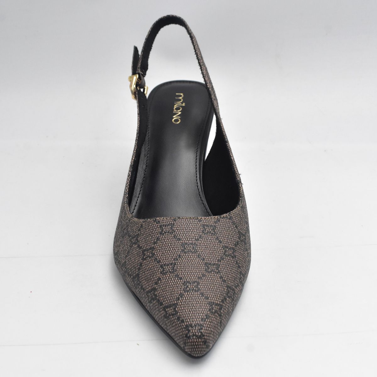 Stylish dark brown slingback pumps with a pointed toe, monogram pattern, and block heel, finished with a gold-tone buckle for a refined, modern appeal.